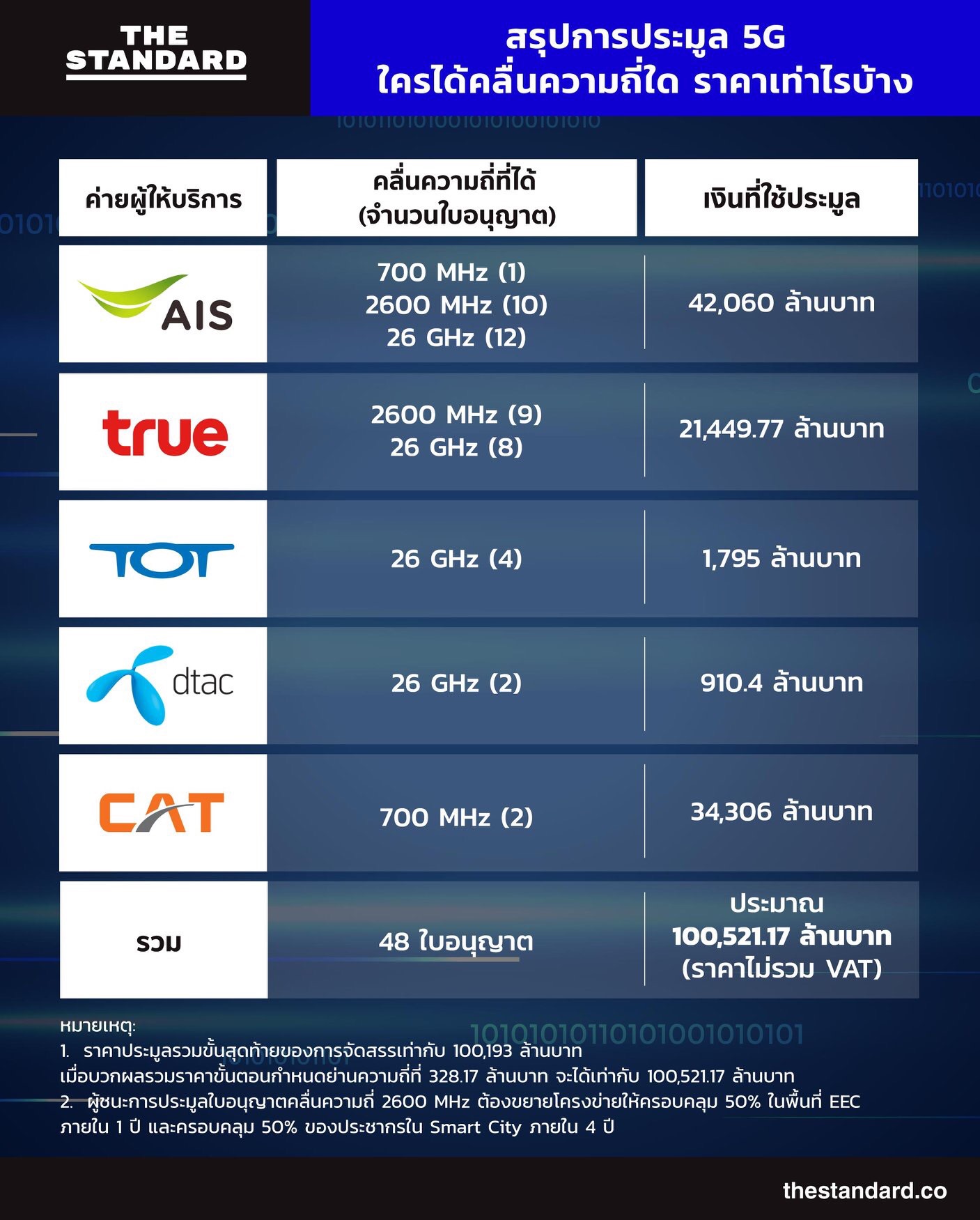 โดย AIS เป็นค่ายผู้ให้บริการที่สามารถประมูลคว้าใบอนุญาตไปครองได้ครอบคลุมมากที่สุดในทุกย่านคลื่นความถี่ ทั้ง 700 MHz, 2600 MHz และ 26 GHz รวมเป็นมูลค่าเงินประมูลกว่า 42,060 ล้านบาท