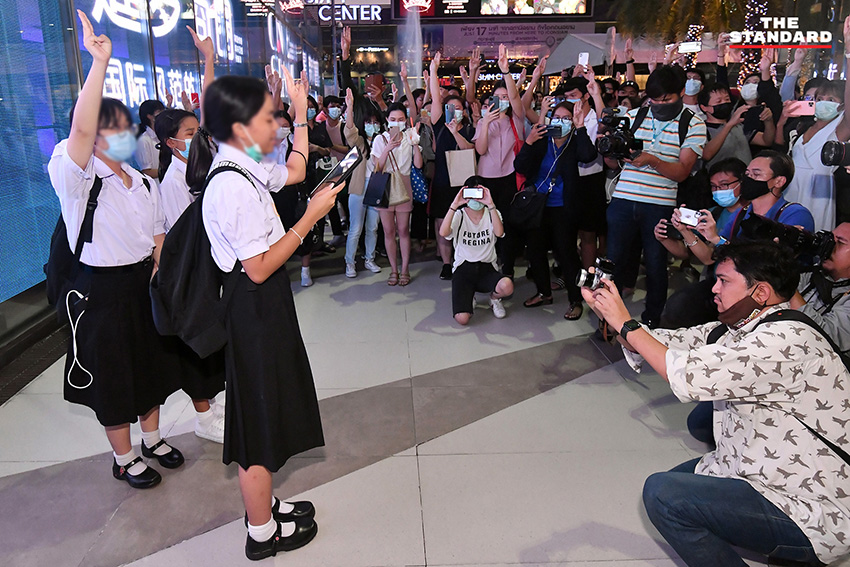 หลังมีการนัดหมายในโซเชียลมีเดียช่วงบ่ายที่ผ่านมาโดยกลุ่มคณะราษฎร แจ้งให้ผู้ชุมนุมรวมตัวบริเวณสถานีรถไฟฟ้าใกล้บ้าน พร้อมทำกิจกรรมยืนตรงเคารพธงชาติ พร้อมชูสามนิ้ว จนกระทั่งเวลา 18.00 น. THE STANDARD ได้เกาะติดบรรยากาศบริเวณสถานีรถไฟฟ้าสยาม ที่บริเวณลานพาร์คพารากอน พบนักเรียน นิสิต นักศึกษา และประชาชนกลุ่มหนึ่งรวมตัวกันในบริเวณนี้