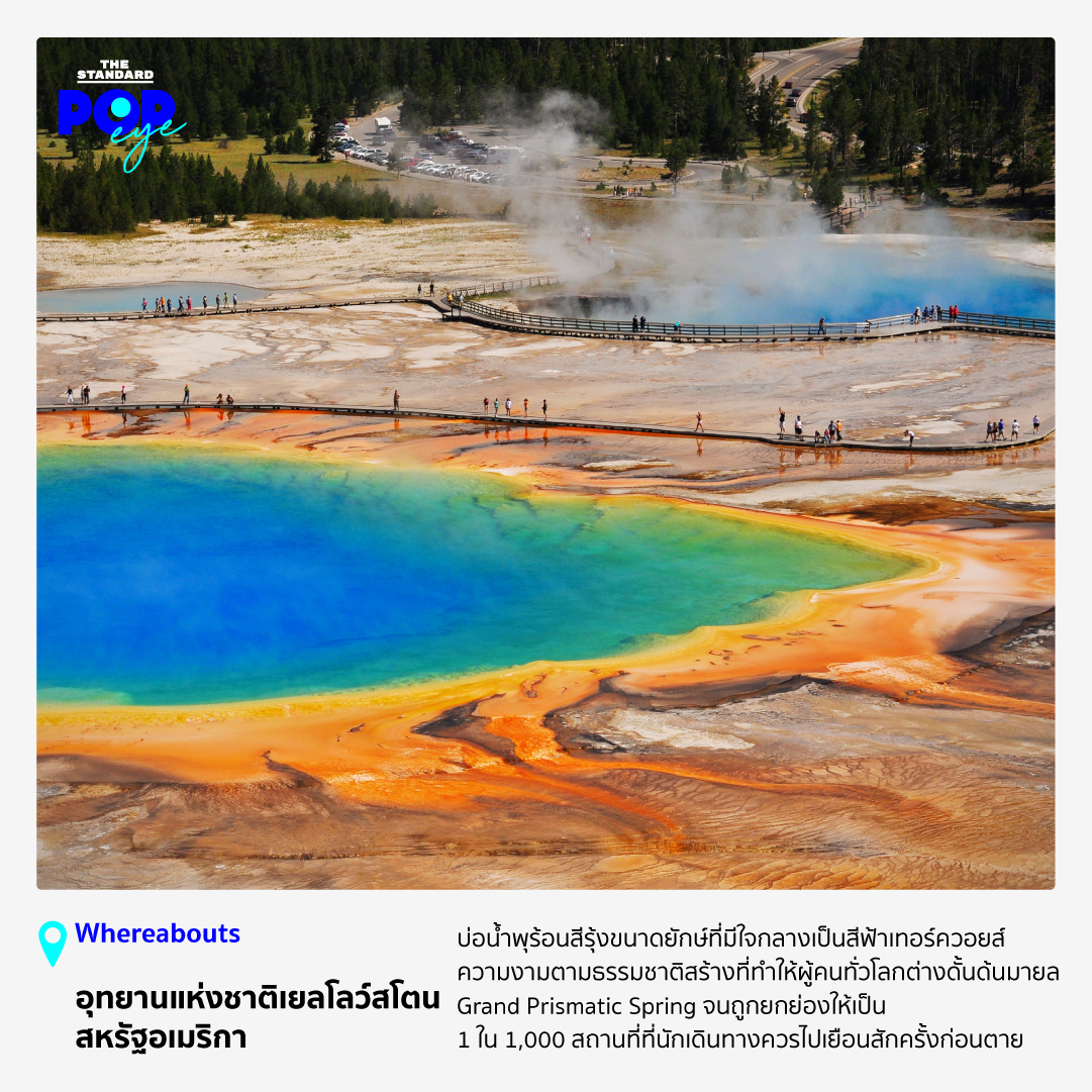 ขอบบ่อสีส้มจัดที่เราเห็นเกิดจากแบคทีเรียและพืชเซลล์เดียวบางชนิดที่สามารถอาศัยอยู่ในน้ำร้อนที่มีอุณหภูมิสูงกว่า 45 องศาเซลเซียสได้ ตรงกลางบ่อเป็นสีฟ้าเทอร์ควอยส์สวยสด สีตัดกันฉูดฉาด ไอร้อนลอยเหนือบ่อประหนึ่งน้ำเดือดตลอดเวลา ภาพเบื้องหลังคือภูเขาป่าสนสีเขียวบวกกับท้องฟ้าใสไร้เมฆ ความงามตามธรรมชาติสร้างที่ใครเห็นเป็นต้องอยากมา จน แพทริเซีย ชูลต์ส ผู้เขียนหนังสือ ‘1,000 Places to See Before You Die’ ยกให้เป็น 1 ใน 1,000 สถานที่ที่เราควรไปเยือนสักครั้งในชีวิต