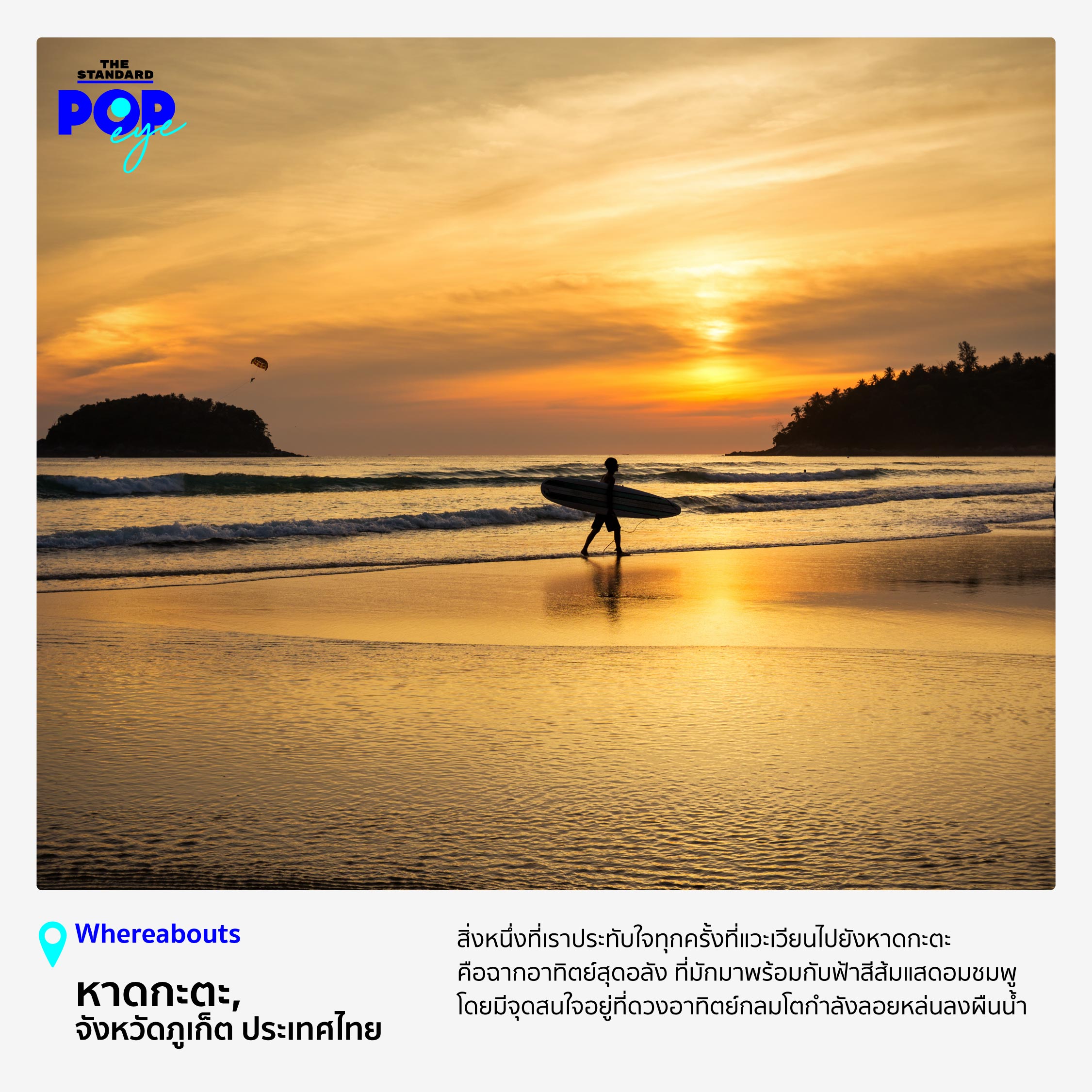 นอกจากบรรยากาศของท้องทะเลที่เอนกายพักผ่อน สิ่งหนึ่งที่เราประทับใจทุกครั้งที่แวะเวียนไปยังหาดกะตะคือฉากอาทิตย์สุดอลัง ที่มักมาพร้อมกับฟ้าสีส้มแสดอมชมพู โดยมีจุดสนใจอยู่ที่ดวงอาทิตย์กลมโตกำลังลอยหล่นลงผืนน้ำ