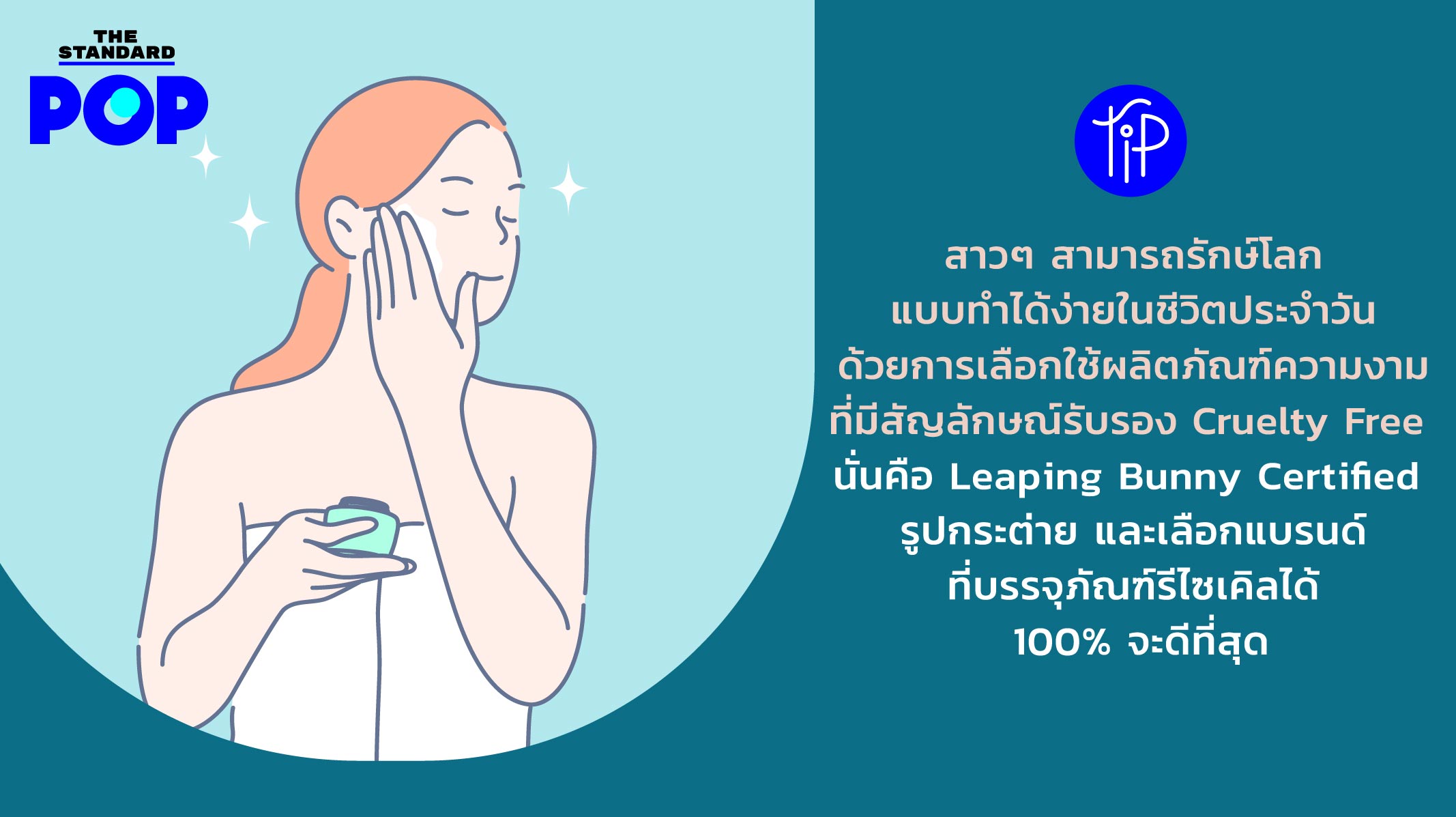 Pop Tip: สาวๆ สามารถรักษ์โลกแบบทำได้ง่ายในชีวิตประจำวันด้วยการเลือกใช้ผลิตภัณฑ์ความงามที่มีสัญลักษณ์รับรอง Cruelty Free นั่นคือ Leaping Bunny Certified รูปกระต่าย และเลือกแบรนด์ที่บรรจุภัณฑ์รีไซเคิลได้ 100% จะดีที่สุด