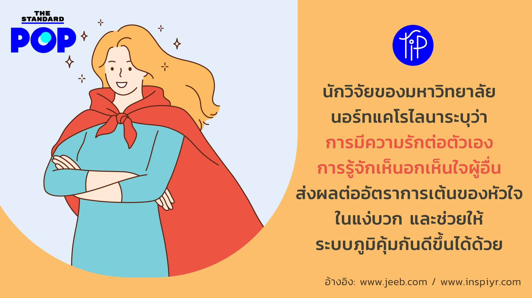 Pop Tip: นักวิจัยของมหาวิทยาลัยนอร์ทแคโรไลนาระบุว่า การมีความรักต่อตัวเอง การรู้จักเห็นอกเห็นใจผู้อื่น ส่งผลต่ออัตราการเต้นของหัวใจในแง่บวก และช่วยให้ระบบภูมิคุ้มกันดีขึ้นได้ด้วย