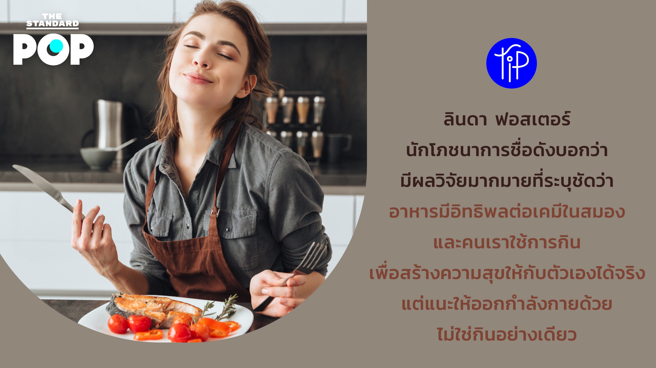 Pop Tip: ลินดา ฟอสเตอร์ นักโภชนาการชื่อดังบอกว่า มีผลวิจัยมากมายที่ระบุชัดว่าอาหารมีอิทธิพลต่อเคมีในสมอง และคนเราใช้การกินเพื่อสร้างความสุขให้กับตัวเองได้จริง แต่แนะให้ออกกำลังกายด้วย ไม่ใช่กินอย่างเดียว