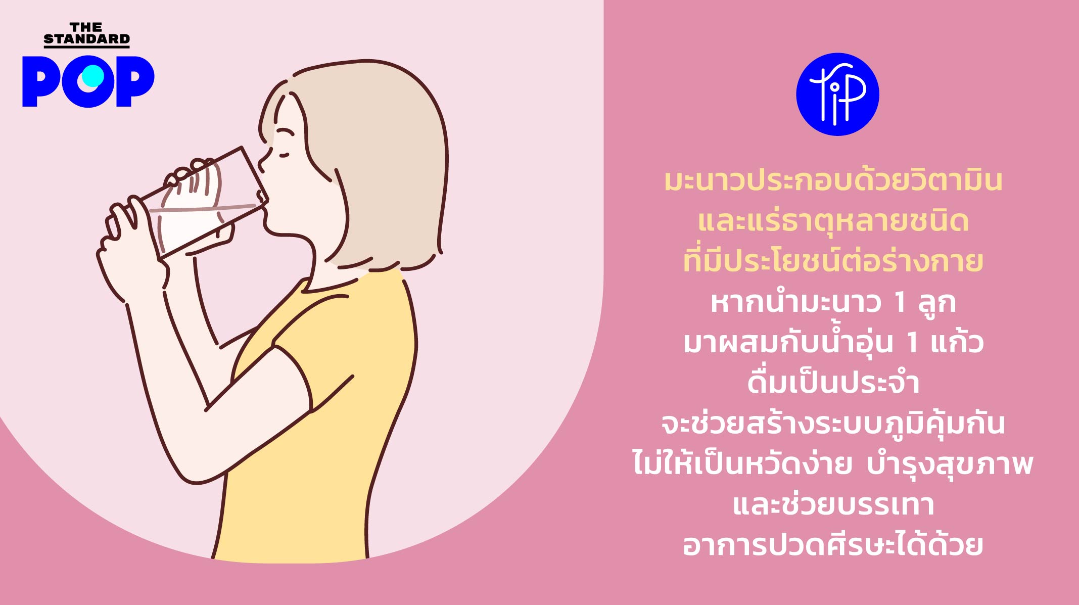 POP Tip: มะนาวประกอบด้วยวิตามินและแร่ธาตุหลายชนิดที่มีประโยชน์ต่อร่างกาย หากนำมะนาว 1 ลูกมาผสมกับน้ำอุ่น 1 แก้ว ดื่มเป็นประจำ จะช่วยสร้างระบบภูมิคุ้มกัน ไม่ให้เป็นหวัดง่าย บำรุงสุขภาพ และช่วยบรรเทาอาการปวดศีรษะได้ด้วย