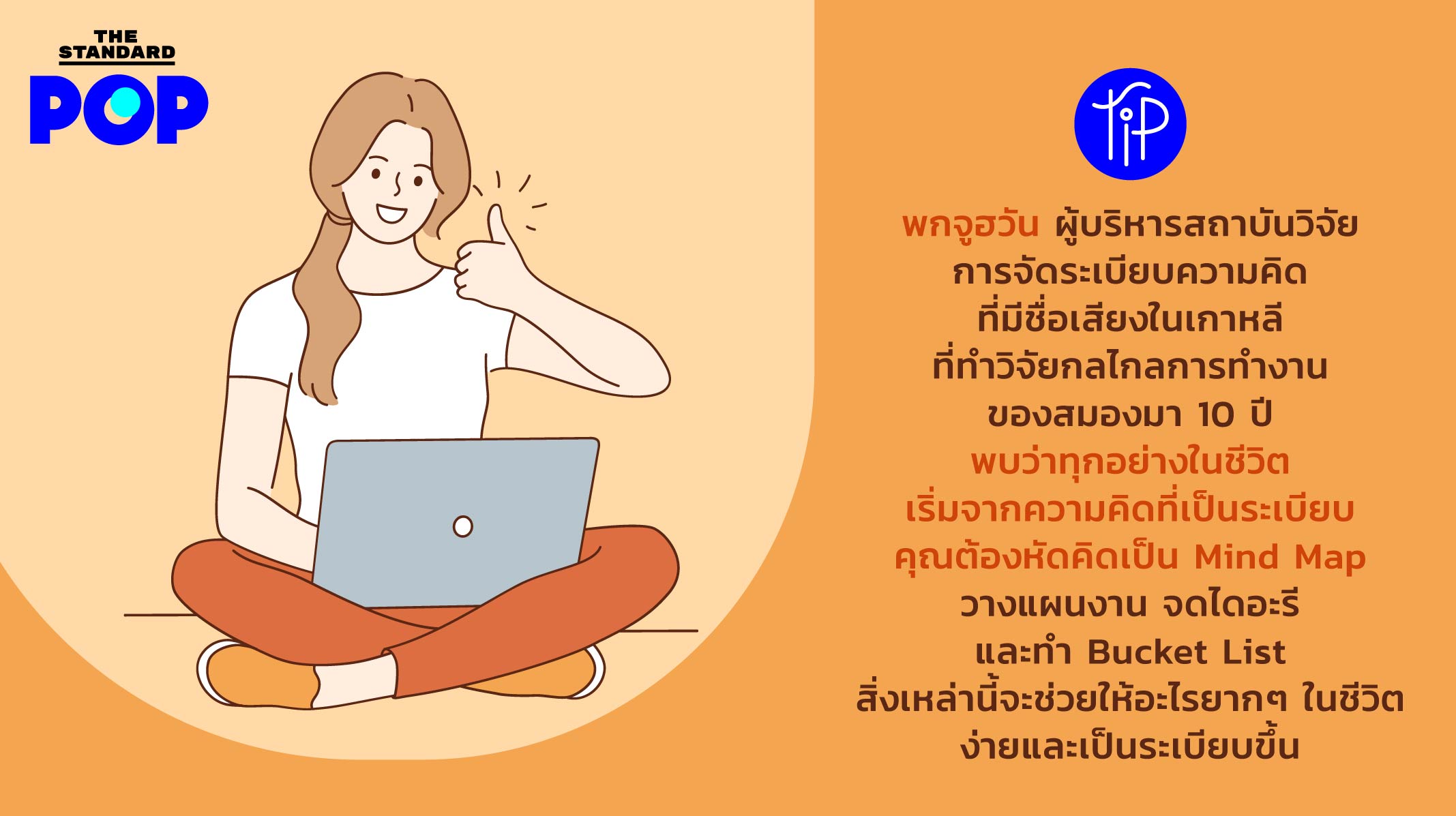 POP Tip: พกจูฮวัน ผู้บริหารสถาบันวิจัยการจัดระเบียบความคิดที่มีชื่อเสียงในเกาหลี ที่ทำวิจัยกลไกลการทำงานของสมองมา 10 ปี พบว่าทุกอย่างในชีวิตเริ่มจากความคิดที่เป็นระเบียบ คุณต้องหัดคิดเป็น Mind Map วางแผนงาน จดไดอะรี และทำ Bucket List สิ่งเหล่านี้จะช่วยให้อะไรยากๆ ในชีวิต ง่ายและเป็นระเบียบขึ้น