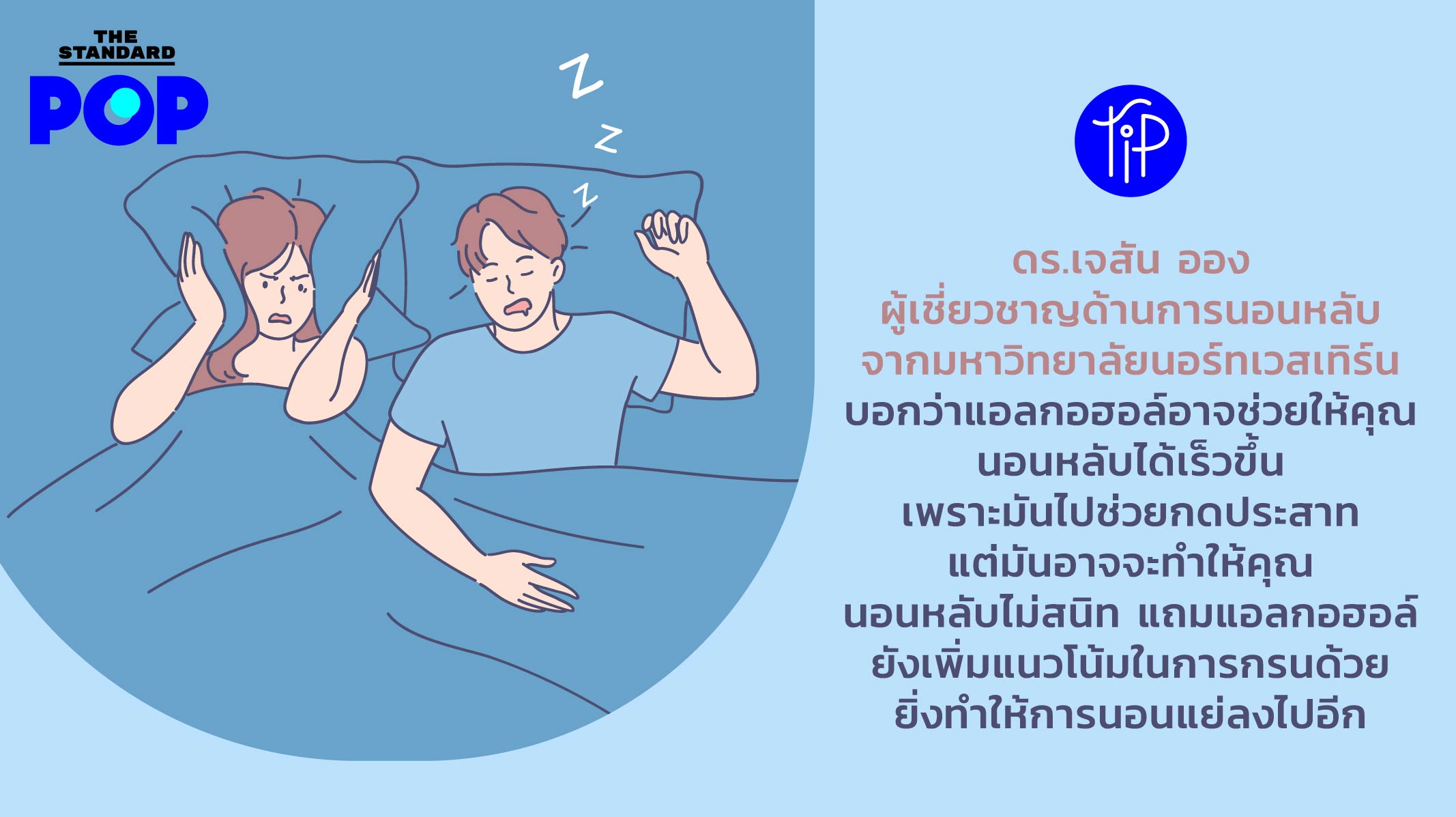 POP Tip: ดร.เจสัน ออง ผู้เชี่ยวชาญด้านการนอนหลับจากมหาวิทยาลัยนอร์ทเวสเทิร์น บอกว่าแอลกอฮอล์อาจช่วยให้คุณนอนหลับได้เร็วขึ้น เพราะมันไปช่วยกดประสาท แต่มันอาจจะทำให้คุณนอนหลับไม่สนิท แถมแอลกอฮอล์ยังเพิ่มแนวโน้มในการกรนด้วย ยิ่งทำให้การนอนแย่ลงไปอีก