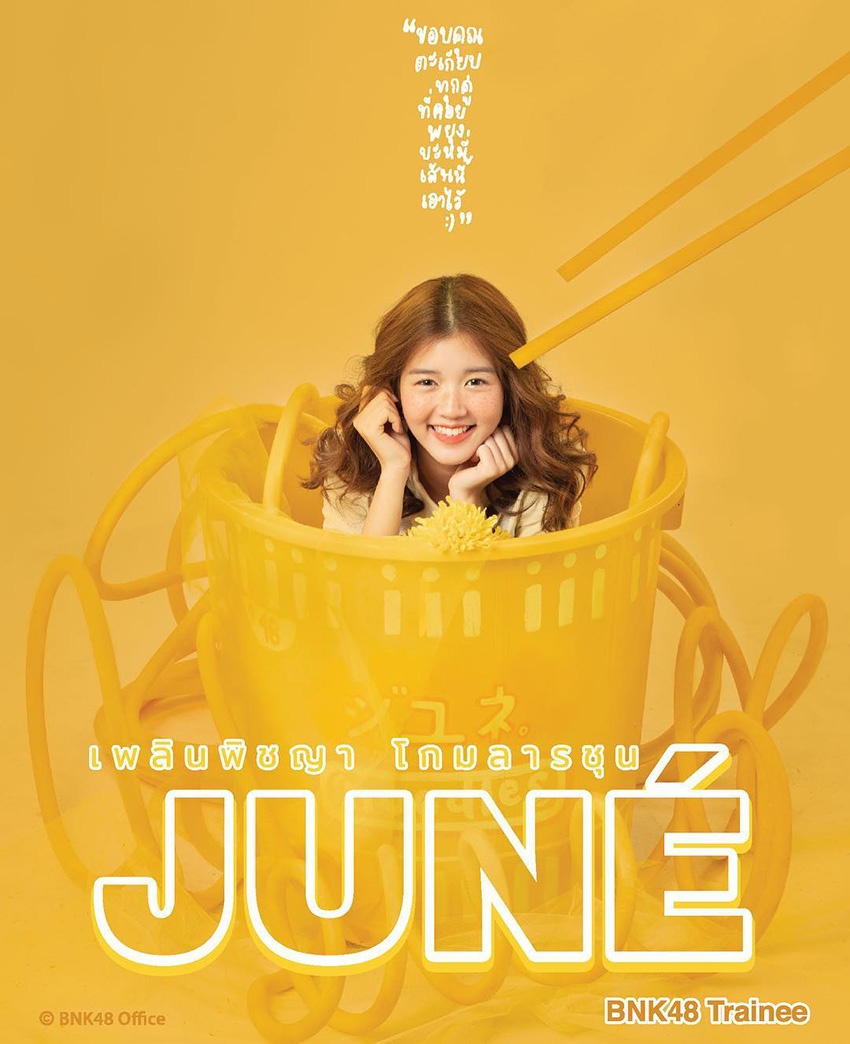 ย้อนไปตอนเลือกตั้งครั้งแรก จูเน่ก็เป็นเหมือนสมาชิกคนอื่นๆ ที่พรีเซนต์ความน่ารักด้วยการพาตัวเองไปนั่งอยู่ในถ้วยบะหมี่ แจกยิ้มสดใส ทำท่าน่ารักออดอ้อนเอาใจ และขอบคุณบรรดา ‘ตะเกียบ’ (ชื่อเรียกแฟนคลับของจูเน่) ที่คอยพยุงเส้นบะหมี่อย่างเธอมาตลอด
