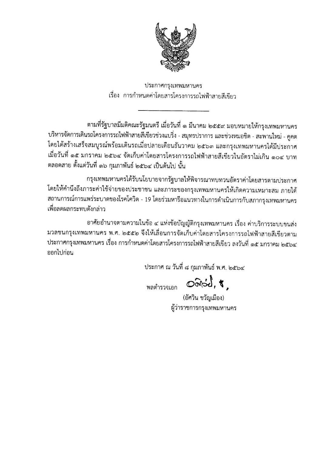 วันนี้ (8 กุมภาพันธ์) พล.ต.อ. อัศวิน ขวัญเมือง ผู้ว่าราชการกรุงเทพมหานคร ลงนามในประกาศกรุงเทพมหานคร เรื่อง การกำหนดค่าโดยสารโครงการรถไฟฟ้าสายสีเขียว ลงวันที่ 15 มกราคม 2564 สำหรับรถไฟฟ้าสายสีเขียวราคาไม่เกิน 104 บาทออกไปก่อน เพื่อลดผลกระทบของประชาชนในสถานการณ์การแพร่ระบาดของโรคโควิด-19