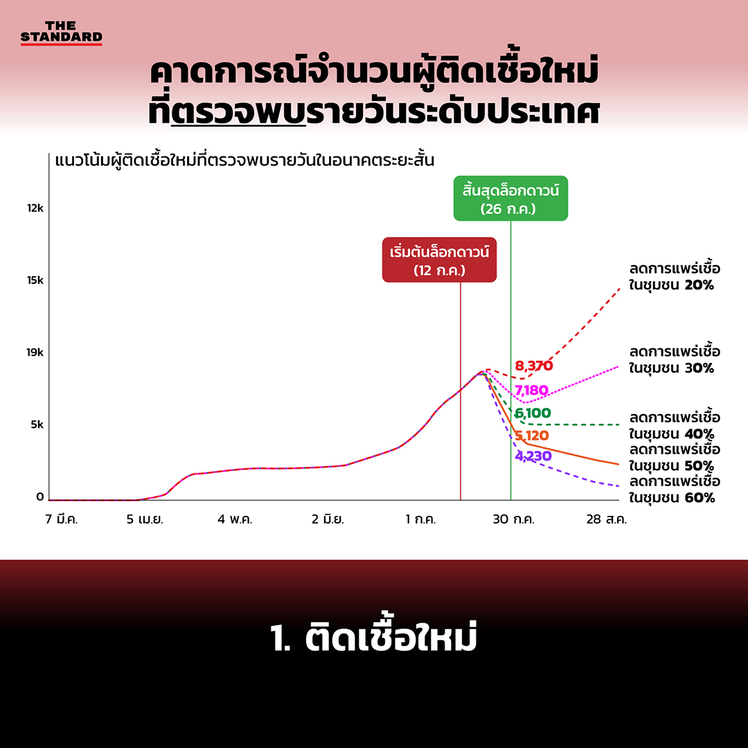 ซึ่งการแปลงตัวเลข 50% เป็นมาตรการควบคุมโรคนั้นค่อนข้างยาก อาจเทียบจากมาตรการ ‘กึ่งล็อกดาวน์’ ที่บังคับใช้เมื่อวัน 28 มิถุนายน จำนวนผู้ติดเชื้อตรงกับเส้นแนวโน้มว่าลดการแพร่เชื้อในชุมชนได้ประมาณเพียง 10-15% (ส่วนหนึ่งเป็นเพราะมีการเดินทางข้ามจังหวัด ทำให้มีการแพร่เชื้อจากกรุงเทพฯ และปริมณฑลไปยังต่างจังหวัดเพิ่มขึ้น)