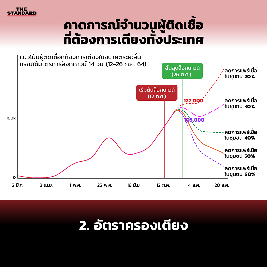 ความเข้มข้นของมาตรการนี้จะส่งผลต่อจำนวนผู้ป่วย ‘ภายหลัง’ จากครบกำหนดล็อกดาวน์ด้วย ซึ่งควรจะต้องลดการแพร่เชื้อในชุมชนให้ได้อย่างน้อย 50% จำนวนผู้ติดเชื้อถึงจะลดลงมาอยู่ภายในขีดความสามารถของระบบสาธารณสุข เพื่อทำให้แนวโน้มลดลงต่อไปจนกลับสู่สถานการณ์เมื่อต้นเดือนมิถุนายน ภายใน 4-5 สัปดาห์นับจากวันเริ่มล็อกดาวน์