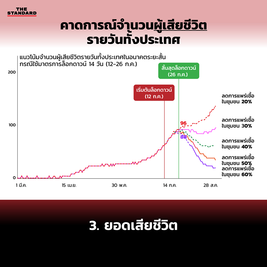 สำหรับผู้เสียชีวิตเป็นสิ่งที่หลีกเลี่ยงไม่ได้ เพราะจำนวนผู้เสียชีวิตจะยังเพิ่มขึ้นอย่างต่อเนื่อง เกิดจากมีผู้ป่วยจำนวนมากอยู่ในระบบบริการสุขภาพอยู่แล้ว และบางส่วนเริ่มอาการหนัก จึงต้องเตรียมใจว่าจำนวนผู้เสียชีวิตในระยะ 8 สัปดาห์นับจากวันเริ่มล็อกดาวน์ ‘อาจจะ’ ยังไม่ลดลงมาเหมือนช่วงต้นเดือนมิถุนายนที่ผ่านมา