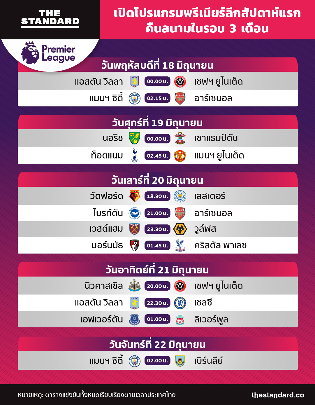 THE STANDARD ได้รวบรวมโปรแกรมการแข่งขันในช่วงสัปดาห์แรกของการกลับคืนสนามในรอบ 3 เดือนมาให้แฟนบอลได้ชมกันว่ามีคู่ไหนน่าสนใจบ้าง