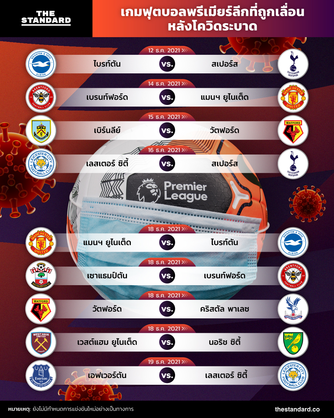 สถานการณ์การระบาดของโควิดในสโมสรฟุตบอลระดับพรีเมียร์ลีกรุนแรงขึ้นอย่างรวดเร็ว และทำให้มีเกมการแข่งขันที่ต้องถูกเลื่อนออกไปอย่างกะทันหันจำนวนมาก