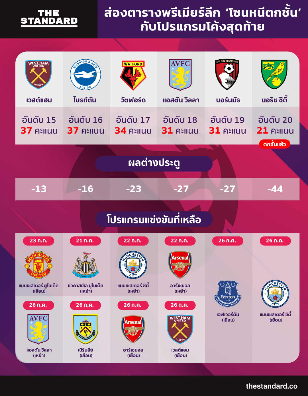 THE STANDARD ขอพาผู้อ่านไปส่องตารางคะแนนพรีเมียร์ลีก ประจำฤดูกาล 2019-20 ว่าถึงตอนนี้ทีมที่ต้องหนีการตกชั้นมีทีมใดบ้าง และโปรแกรมที่เหลืออยู่เป็นอย่างไร โดย ณ เวลานี้ มี นอริช ซิตี้ ตกชั้นไป 1 ทีมแล้ว และยังมีทีมที่ต้องตกชั้นอีก 2 ทีม