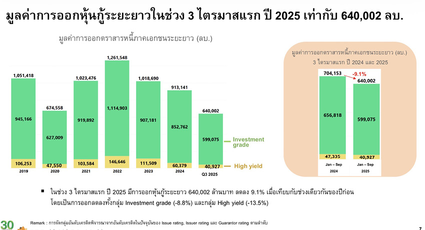 โดยการออกตราสารหนี้ภาคเอกชนระยะยาว (หุ้นกู้ระยะยาว) ในช่วง 3ไตรมาสแรกของปี 2568 ลดลง 9.1% จากช่วงเดียวกันของปีที่แล้ว โดยมีมูลค่าการออกอยู่ที่ 640,002 ล้านบาท ลดลง 9.1% เมื่อเทียบกับช่วงเดียวกันของปีก่อน เป็นอัตราการปรับลดลงที่ต่ำกว่าเมื่อตอนไตรมาส 2 ที่ผ่านมา จากการที่ผู้ออกในกลุ่ม Investment grade เพิ่มการออกขึ้นมากในไตรมาส 3
