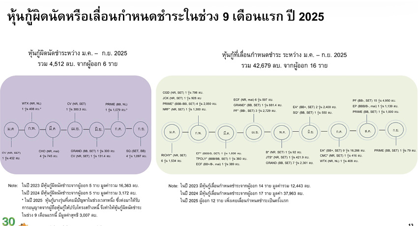 อริยาเปิดเผยอีกว่า การผิดนัดชำระ (Default)ในไตรมาส 3 พบว่า มีผู้ผิดนัดเพิ่มขึ้น 1 บริษัท คือ บริษัท สหกลอิควิปเมนท์ จำกัด (มหาชน) หรือ SQ ทำให้มูลค่าหุ้นกู้ที่มีการผิดนัด ตั้งแต่มกราคม-กันยายนรวม 4.5 พันล้านบาท จากผู้ออกหุ้นกู้ 6 ราย