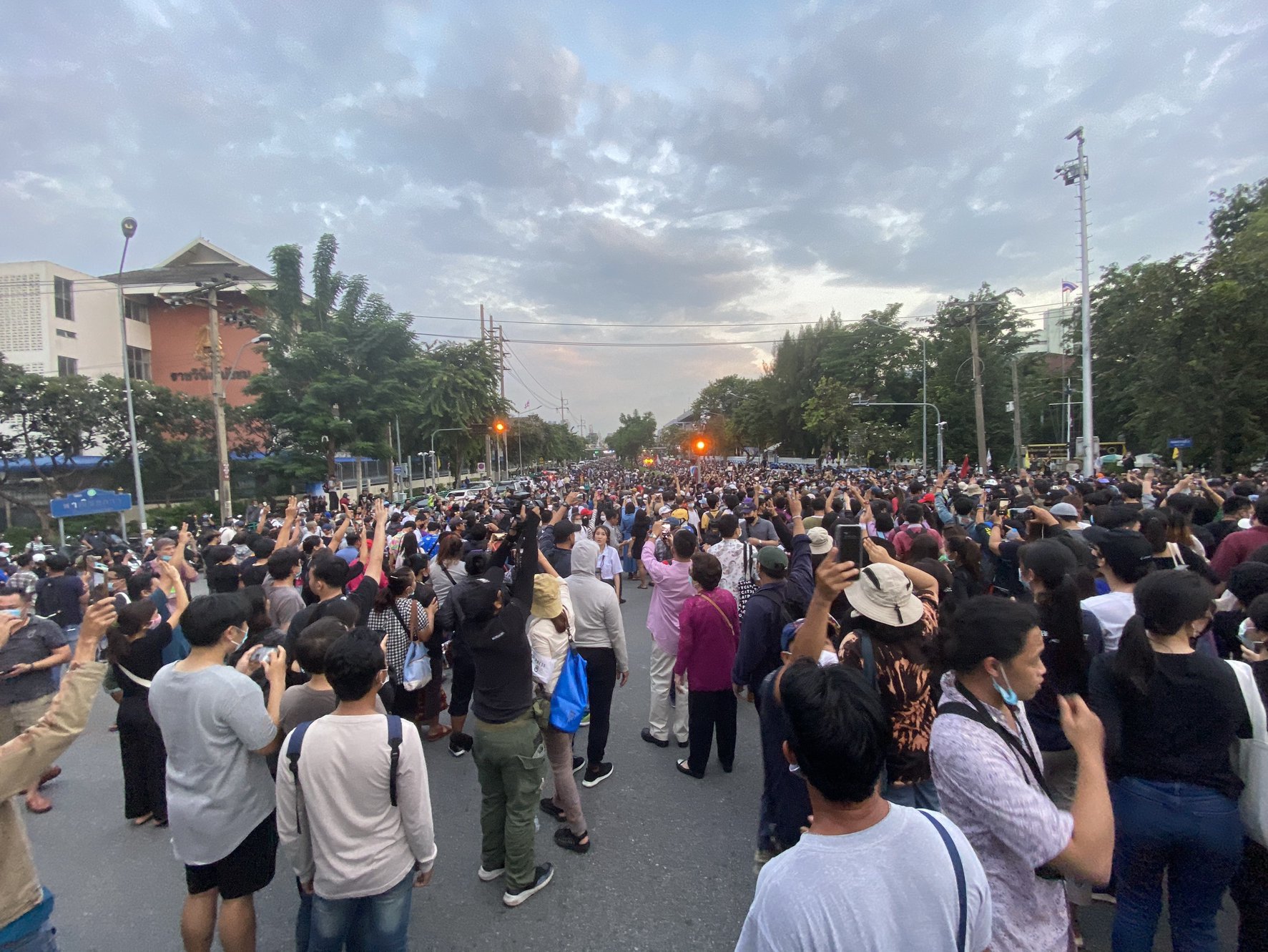 14.37 น. กลุ่มผู้ชุมนุมคณะราษฎรเคลื่อนขบวนมาถึงบริเวณแยกป้อมมหากาฬ สะพานผ่านฟ้าลีลาศ และเข้าประชิดแนวกั้นของตำรวจที่วางกำลังไว้ก่อนหน้านี้ ทำให้สถานการณ์เกิดความตึงเครียดมากขึ้น ขณะที่ท้ายขบวนยังอยู่ที่อนุสาวรีย์ประชาธิปไตย