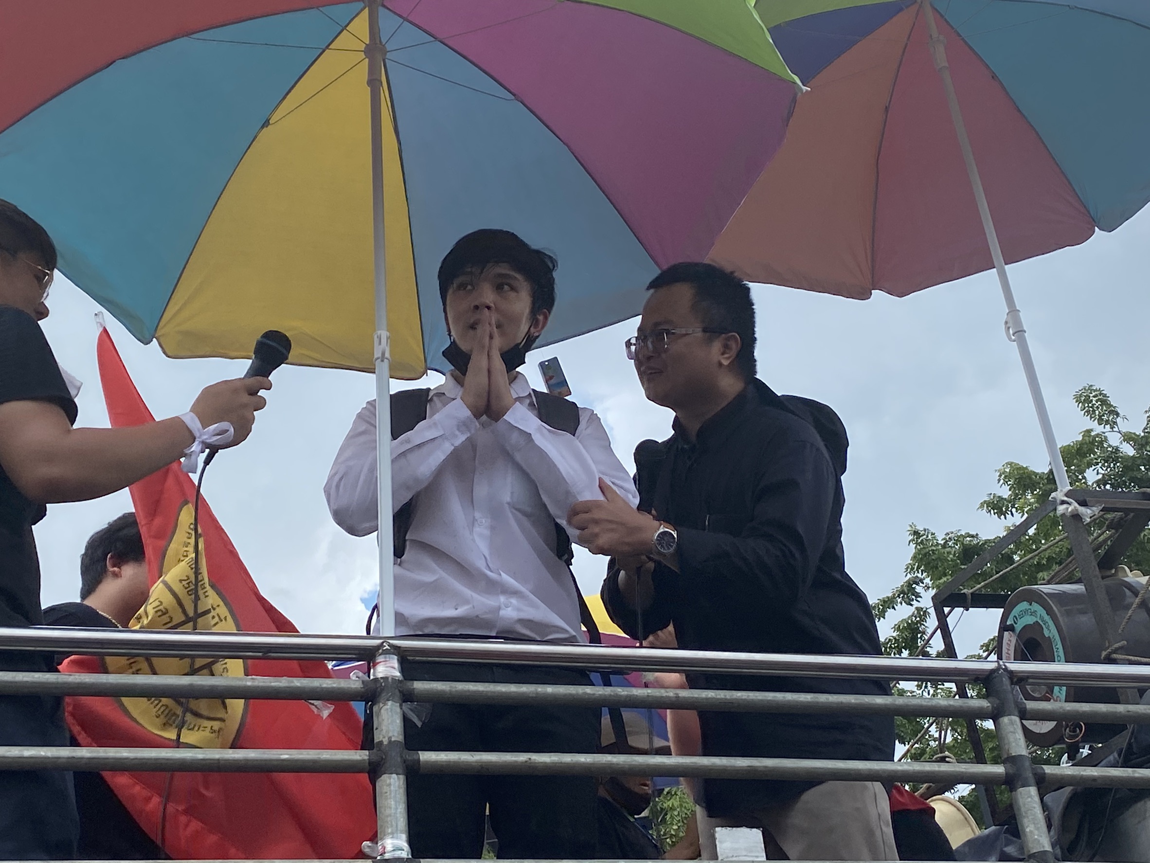 11.22 น. รุ้ง-ปนัสยา สิทธิจิรวัฒนกุล และเพนกวิน-พริษฐ์ ชิวารักษ์ แกนนำกลุ่มคณะราษฎร เดินทางมาถึงอนุสาวรีย์ประชาธิปไตยแล้ว