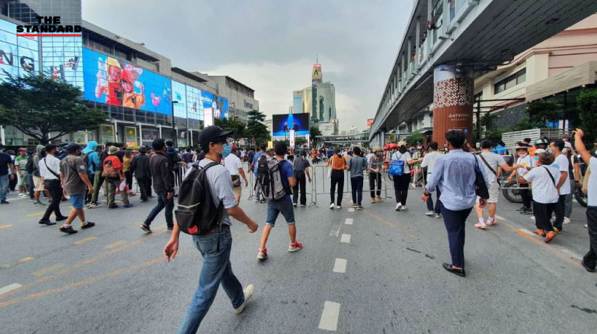 15.00 น. เจ้าหน้าที่ปิดทางเข้าสกายวอล์กฝั่งเกษรวิลเลจ ขณะที่ตำรวจควบควมฝูงชนเริ่มตรึงกำลัง ก่อนถึงเวลานัดหมายชุมนุมของกลุ่มคณะราษฎรในเวลา 16.00 น.