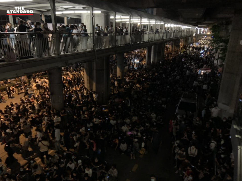20.50 น. ภาพบรรยากาศมุมสูงจากทางเชื่อมสกายวอล์กแสดงให้เห็นภาพรวมจำนวนของผู้ชุมนุมบริเวณแยกราชประสงค์