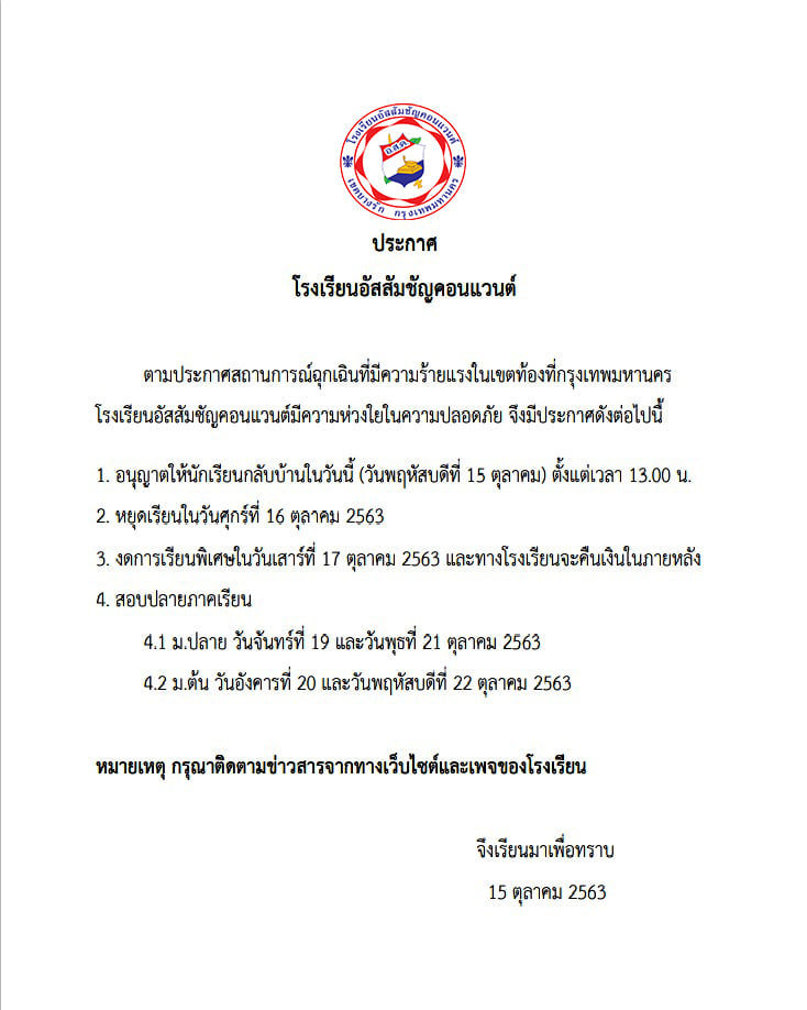 ล่าสุดวันนี้ (15 ตุลาคม) ทางเพจเฟซบุ๊ก ‘โรงเรียนอัสสัมชัญคอนแวนต์-Assumption Convent’ ได้ออกประกาศระบุว่า ตามประกาศสถานการณ์ฉุกเฉินที่มีความร้ายแรงในเขตท้องที่กรุงเทพมหานคร โรงเรียนอัสสัมชัญคอนแวนต์ที่มีความห่วงใยในความปลอดภัย จึงมีประกาศดังต่อไปนี้
