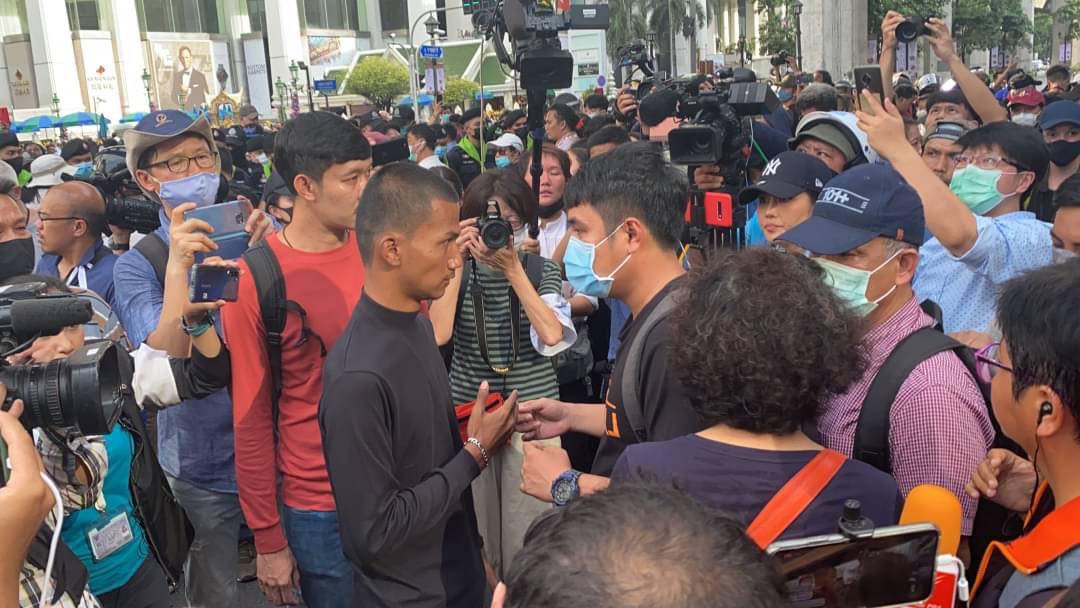 19.15 น. การ์ดมวลชนคณะราษฎรเริ่มปิดกั้นพื้นที่เข้า-ออกบริเวณชุมนุมฝั่งที่มุ่งมาจากประตูน้ำ เพื่อไม่ให้รถจักรยานยนต์สัญจรผ่านเข้าไปยังพื้นที่การชุมนุม