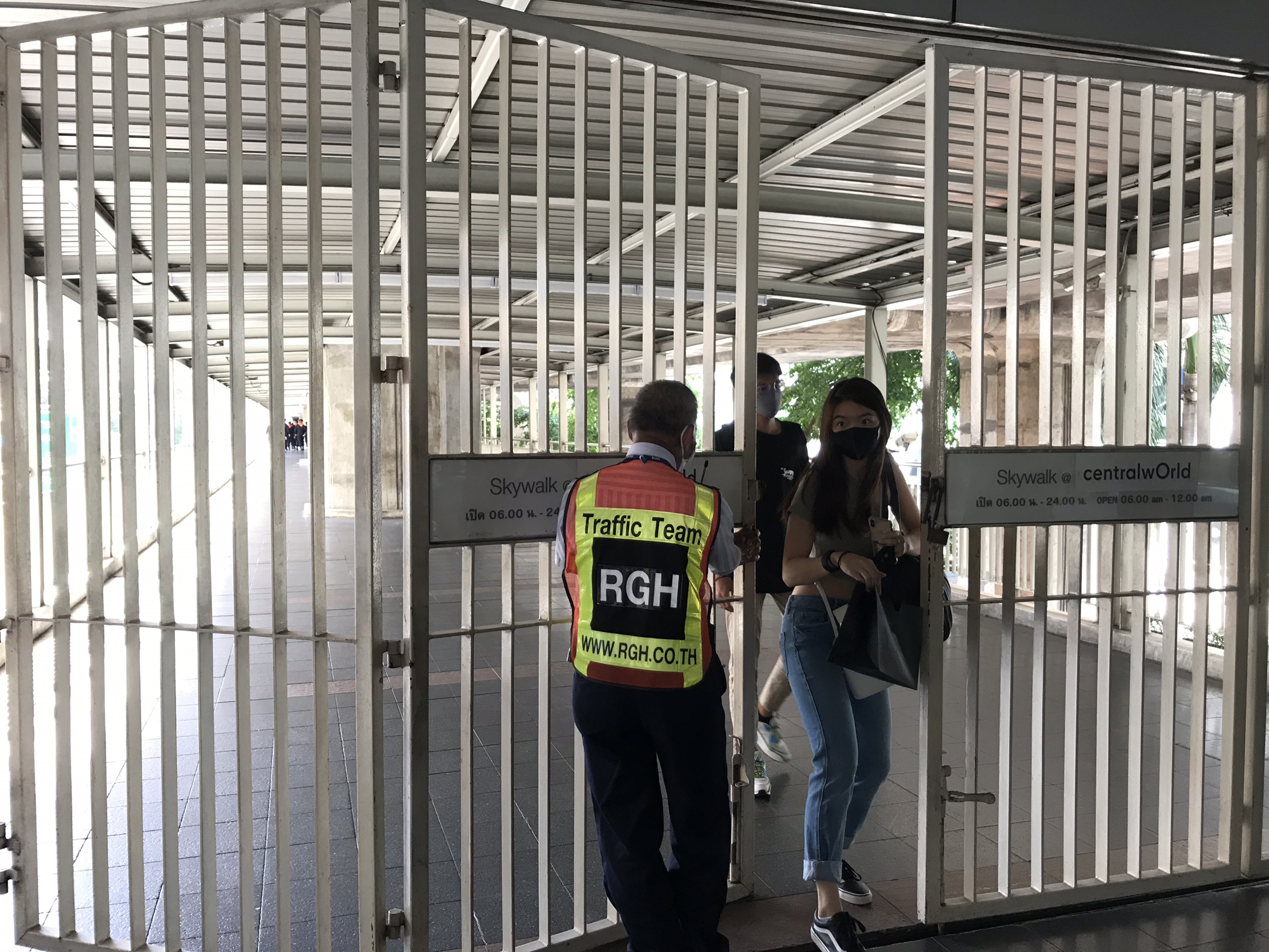 14.50 น. เจ้าหน้าที่รักษาความปลอดภัยเริ่มปิดประตูรั้วบริเวณสกายวอล์กฝั่งเซ็นทรัลเวิลด์ ด้าน BTS ยังคงเปิดให้บริการตามปกติ