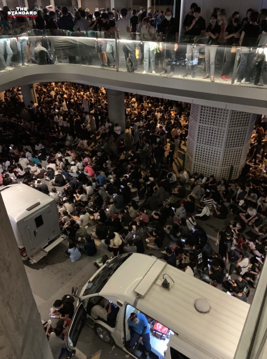 19.50 น. บรรยากาศมวลชนจากมุมมองบนสกายวอล์กฝั่งสำนักงานตำรวจแห่งชาติ