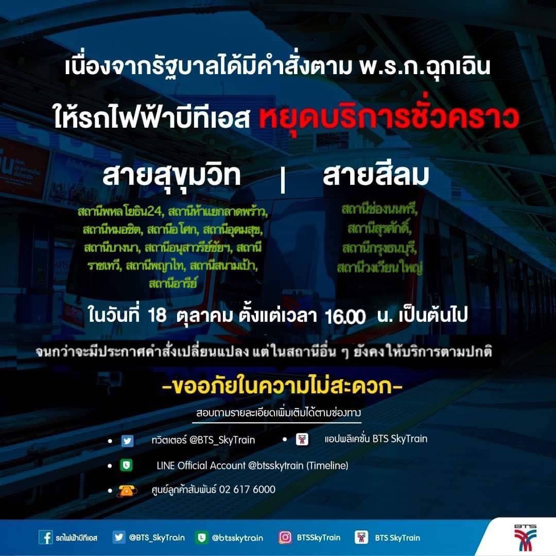 ในคำสั่งระบุว่า สั่งปิดรถไฟฟ้า BTS ได้แก่ สถานีพหลโยธิน 24, ห้าแยกลาดพร้าว, หมอชิต, อุดมสุข, อโศก, บางนา, ช่องนนทรี, สุรศักดิ์, วงเวียนใหญ่ และกรุงธนบุรี