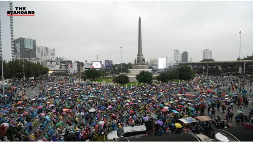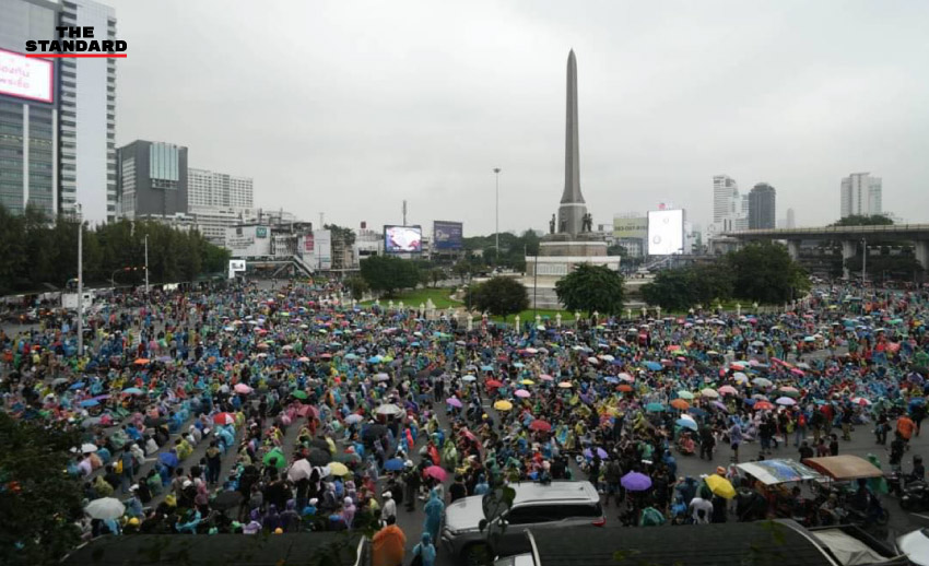 16.40 น. ฝนเริ่มตกรอบบริเวณอนุสาวรีย์ชัยสมรภูมิ มวลชนเริ่มกางร่ม ขณะที่พยายามขยายพื้นที่การชุมนุมบนพื้นผิวถนนให้เต็มพื้นที่