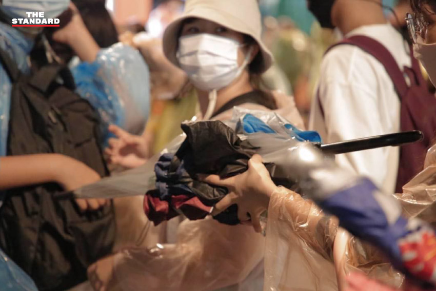19.25 น. มวลชนตั้งแถวบริเวณถนนพญาไท พร้อมช่วยกันส่งต่ออุปกรณ์ป้องกันตัวให้กับอาสาสมัครการ์ดที่ตั้งแนวป้องกันอยู่ด้านหน้า