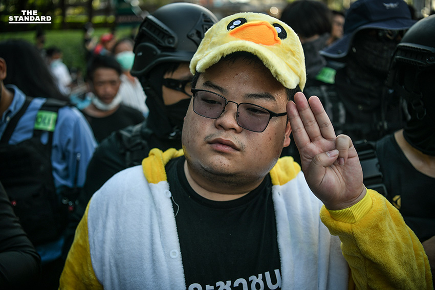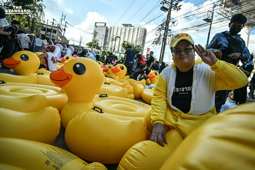 ในการชุมนุม #ม็อบ25พฤศจิกาไปSCB ที่ธนาคารไทยพาณิชย์ สำนักงานใหญ่วันนี้ (25 พฤศจิกายน) เวลาประมาณ 15.21 น. พริษฐ์ ชิวารักษ์ หรือ เพนกวิน ปรากฏตัวในชุดเป็ดเหลือง เพื่อแสดงออกเชิงสัญลักษณ์ว่าวันนี้ตนเองใส่สีเหลือง พร้อมตั้งคำถามว่า ฝ่ายรัฐจะยังพยายามทำให้เราเป็นผู้ใช้ความรุนแรงอยู่หรือไม่ พร้อมยืนยันว่าพวกตนมาแบบสันติวิธี โดยมีสัญลักษณ์เป็ดเหลืองและไก่โอ๊กเป็นเครื่องยืนยันว่าการชุมนุมในวันนี้ปราศจากอาวุธ