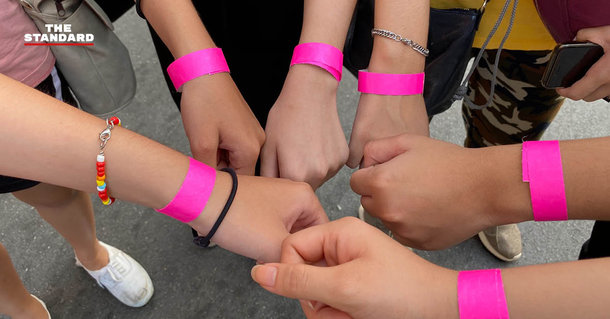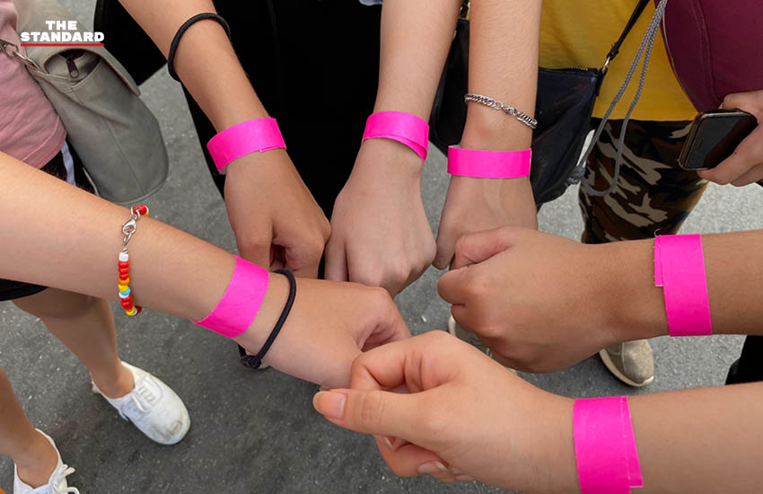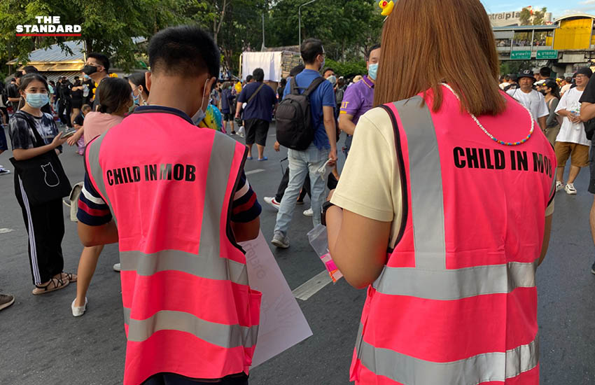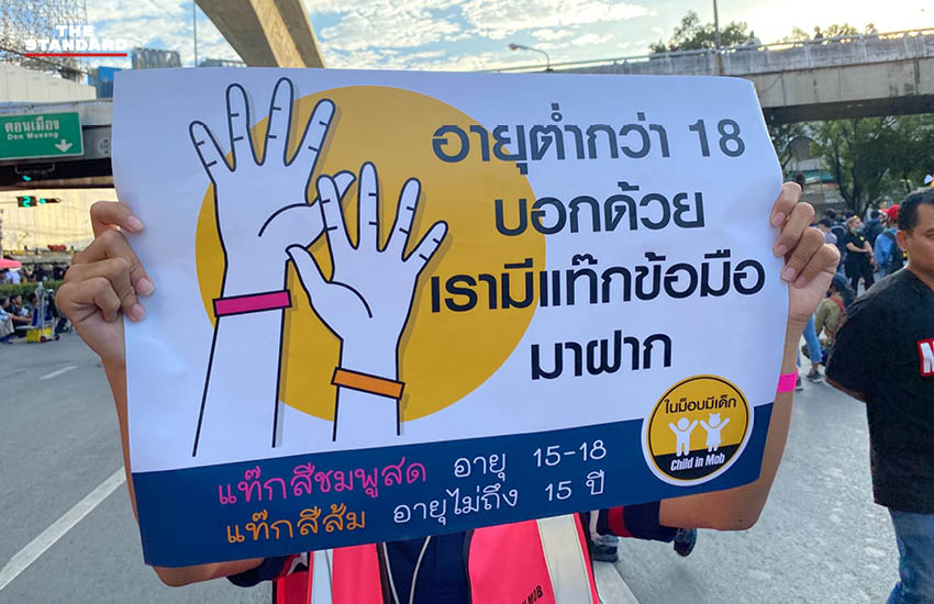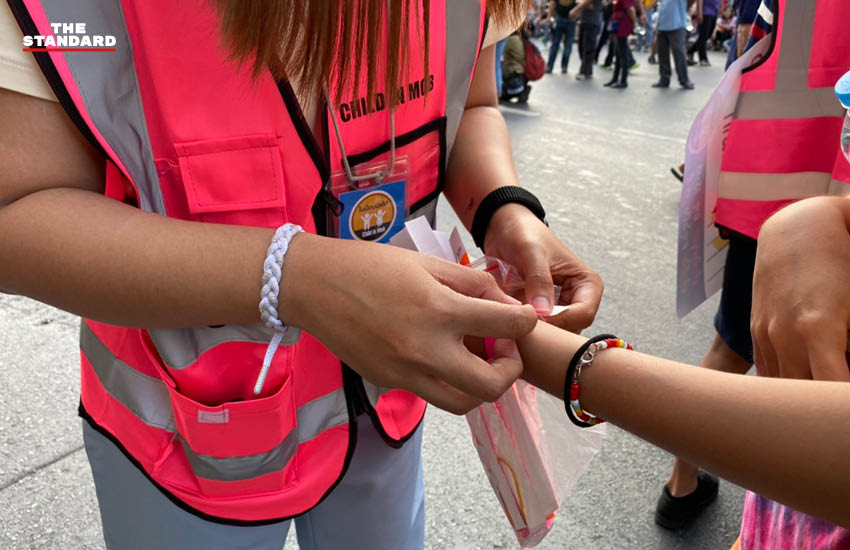 อาสาสมัคร Child in Mob แจกแท็กข้อมือให้กับเยาวชนที่เข้าร่วมชุมนุมที่บริเวณห้าแยกลาดพร้าว โดยแท็กสีชมพูสดคือเยาวชนอายุ 15-18 ปี ส่วนแท็กสีส้มคือเยาวชนที่อายุยังไม่ถึง 15 ปี เพื่อสื่อสารให้บุคคลทั่วไปทราบว่า ‘ในม็อบมีเด็ก’