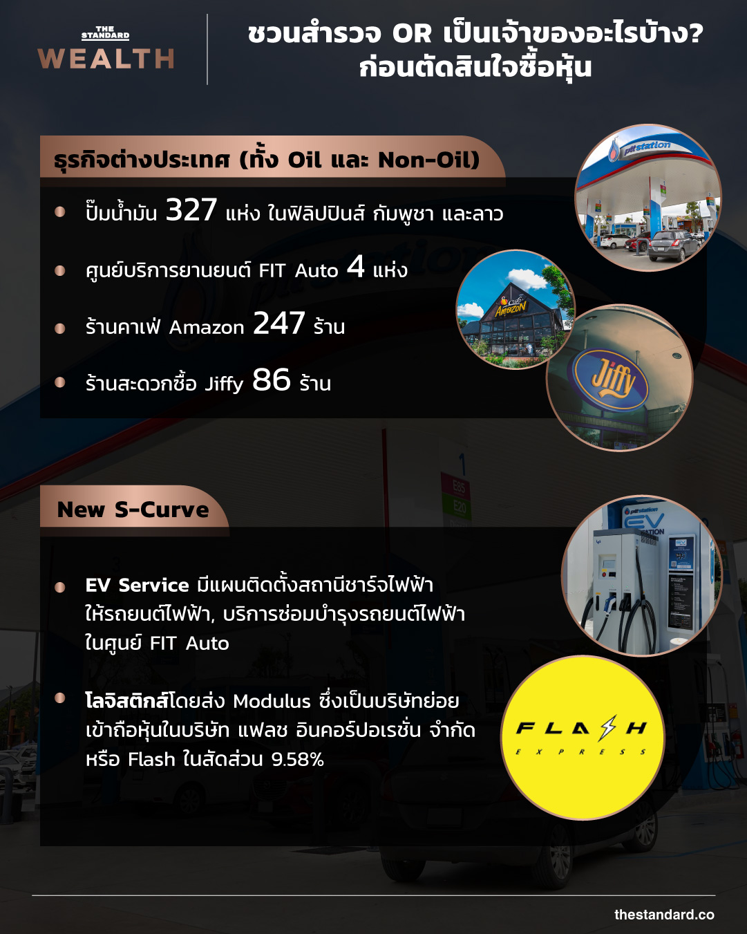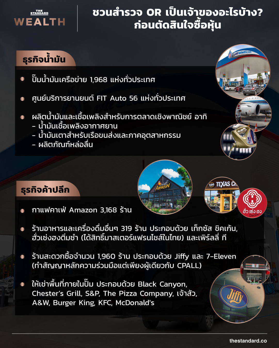 ชวนสำรวจปั๊มน้ำมัน ปตท. ซึ่งเป็นสินทรัพย์หลักของ บมจ.ปตท. และการค้าปลีก (OR) ว่าภายในมีกิจการอะไรบ้าง ซึ่งพื้นที่ส่วนใหญ่ยังคงเป็นพื้นที่สำหรับให้บริการธุรกิจน้ำมัน ส่วนพื้นที่สำหรับธุรกิจร้านค้าปลีก จะมีทั้งส่วนที่ OR เป็นเจ้าของเอง ส่วนที่ได้รับมาสเตอร์แฟรนไชส์ และส่วนที่อยู่ภายใต้ความร่วมมือกับพันธมิตร ดังนี้