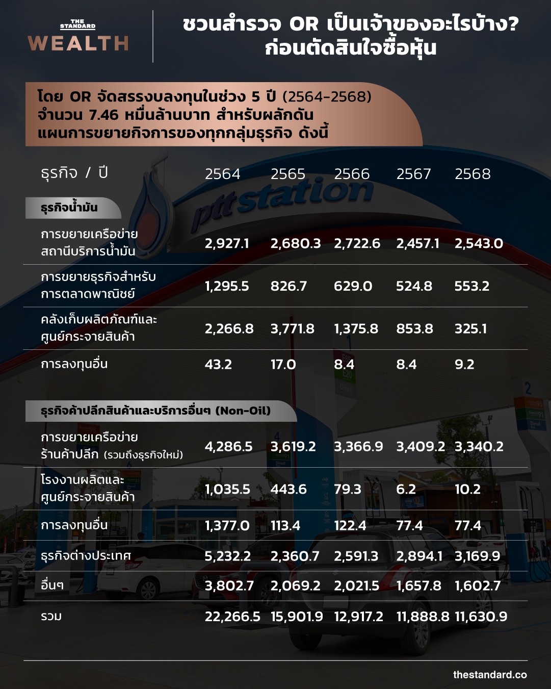 โดย OR จัดสรรงบลงทุนในช่วง 5 ปี (2564-2568) จำนวน 7.46 หมื่นล้านบาท สำหรับผลักดันแผนการขยายกิจการของทุกกลุ่มธุรกิจ ดังนี้