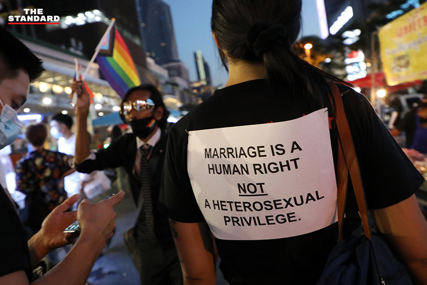 วันนี้ (28 พฤศจิกายน) ที่สี่แยกราชประสงค์ ช่วงเย็นที่ผ่านมา กลุ่มภาคีสีรุ้งเพื่อการสมรสเท่าเทียม จัดกิจกรรมเชิงสัญลักษณ์ที่ใช้ชื่อว่า ‘เพราะบุคคลนั้นเท่ากัน สมรสจึงต้องเท่าเทียม’ เพื่อแสดงออกเชิงสัญลักษณ์ในการเรียกร้องไปยังรัฐบาล ว่าสิทธิในการสมรสเป็นของทุกเพศ และต้องมีความเท่าเทียม โดยทางกลุ่มเห็นว่า แม้ประเทศไทยจะยอมรับ LGBTQ แต่กฎหมายและนโยบายของรัฐยังไม่คุ้มครองบุคคลเพศหลากหลายอย่างทั่วถึง เช่น กฎหมายการจัดตั้งครอบครัว กฎหมายการรับรองอัตลักษณ์บุคคล หรือการป้องกันอาชญากรรม หรือการเกลียดกลัว ดังนั้น เพื่อยืนยันข้อเรียกร้องสมรสเท่าเทียม จะมีการเข้าชื่อเพื่อนำเสนอร่างกฎหมายสมรสเท่าเทียมภาคประชาชน โดยตั้งเป้าให้ได้ 1 ล้านรายชื่อ สามารถลงชื่อผ่าน www.support1448.org ได้