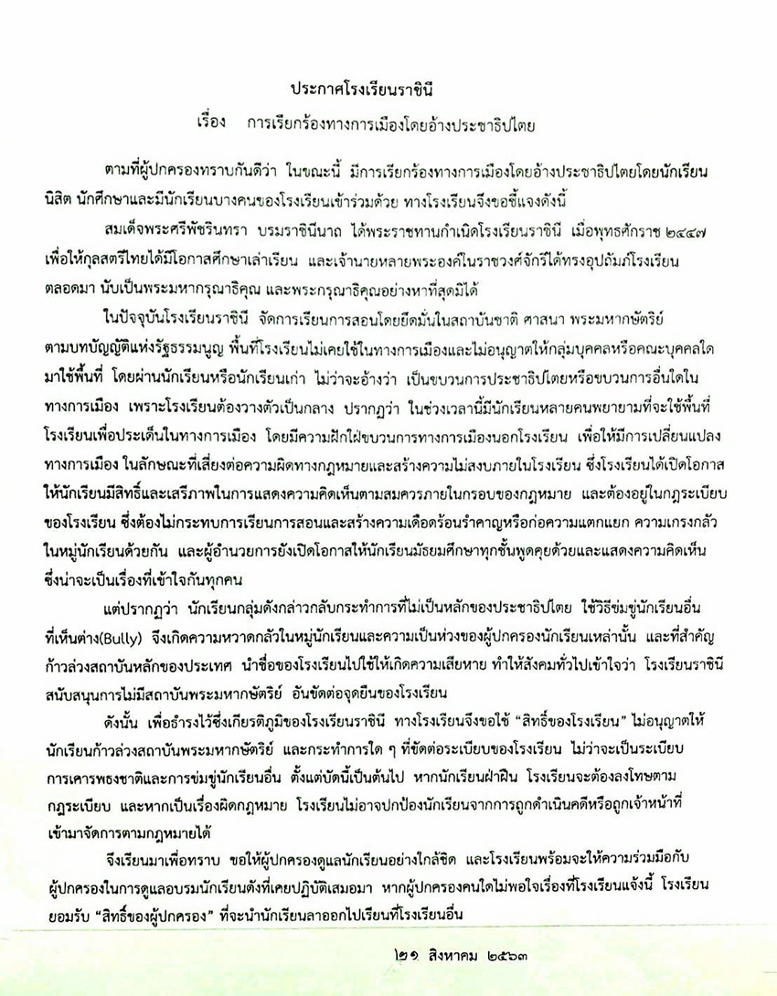 วันนี้ (21 สิงหาคม) เฟซบุ๊กชมรมนักเรียนเก่าราชินี โพสต์ประกาศโรงเรียนราชินี เรื่องการเรียกร้องทางการเมืองโดยอ้างประชาธิปไตย โดยมีเนื้อหาดังนี้