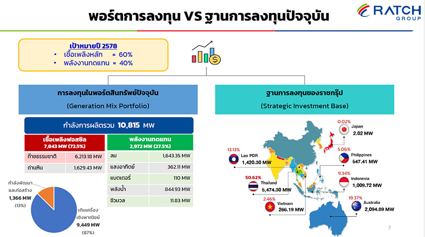 ปัจจุบัน RATCH มีกำลังการผลิตไฟฟ้าทั้งในและต่างประเทศ โดยมีประเทศที่โฟกัสอันดับ 1 คือ ประเทศไทย, อันดับที่ 2 คือ ออสเตรเลีย อันดับที่ 3 คือ สปป. ลาว อันดับที่ 4 คือ อินโดนีเซีย อันดับที่ 5 คือ ฟิลิปปินส์ อันดับที่ 6 คือ เวียดนาม, และ อันดับที่ 7 คือ ญี่ปุ่น มีพอร์ตกำลังผลิตไฟฟ้ารวมประมาณ 10,000 เมกะวัตต์ โดยมีสัดส่วนเชื้อเพลิงหลัก (ฟอสซิล) มีสัดส่วนอยู่ที่ 72% และพลังงานหมุนเวียน (RE) มีสัดส่วนอยู่ที่ 27-28%