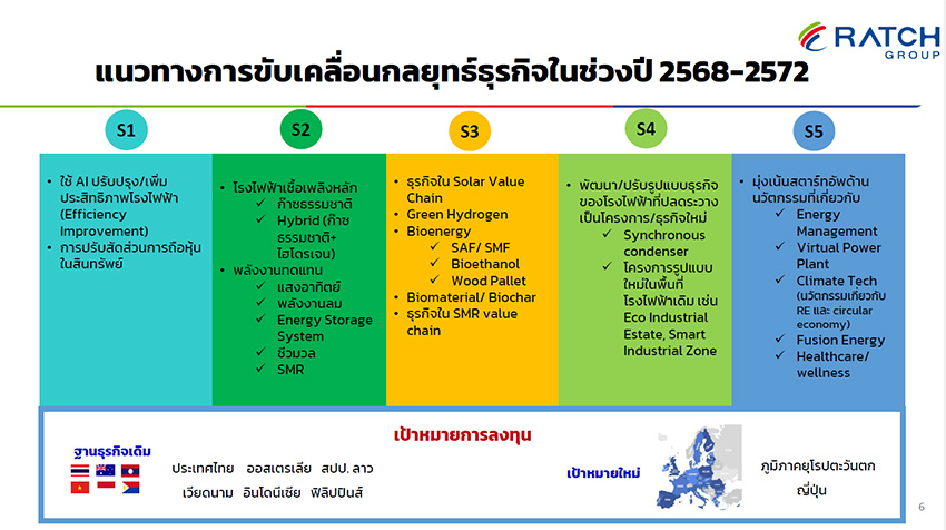 กลยุทธ์ใหม่ มุ่งเน้นการขยายสัดส่วนพลังงานหมุนเวียน (Renewable Energy: RE) อย่างจริงจัง และการลงทุนในธุรกิจนวัตกรรมที่เกี่ยวเนื่องกับพลังงาน โดย RATCH ยังคงตั้งเป้าหมายการเติบโตของ EBITDA โดยเฉลี่ยปีละ 5% อย่างต่อเนื่องในช่วงปี 2568-2572 แม้จะอยู่ในสภาวะที่ตลาดพลังงานมีการแข่งขันสูง