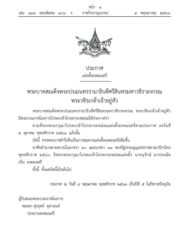 ประกาศ ณ วันที่ 4 พฤษภาคม พุทธศักราช 2563 เป็นปีที่ 5 ในรัชกาลปัจจุบัน