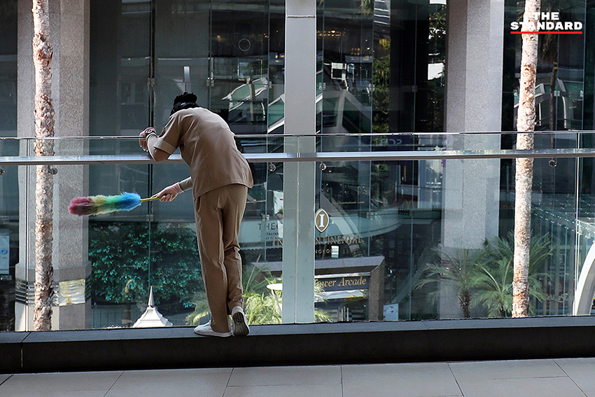 พนักงานทำความสะอาดกำลังปัดกวาดบริเวณสกายวอล์กย่านราชประสงค์ ขณะที่ผู้คนสัญจรผ่านไปมามีจำนวนลดลง