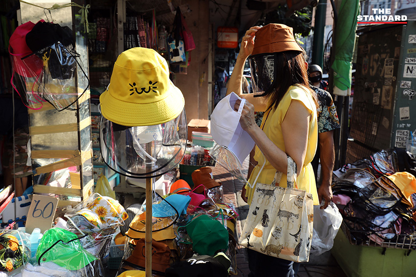 ประชาชนเลือกซื้อหมวกที่มีแผ่นพลาสติกปกป้องใบหน้า หมวกชนิดนี้เป็นสินค้าที่ขายค่อนข้างดีที่ตลาดสำเพ็ง