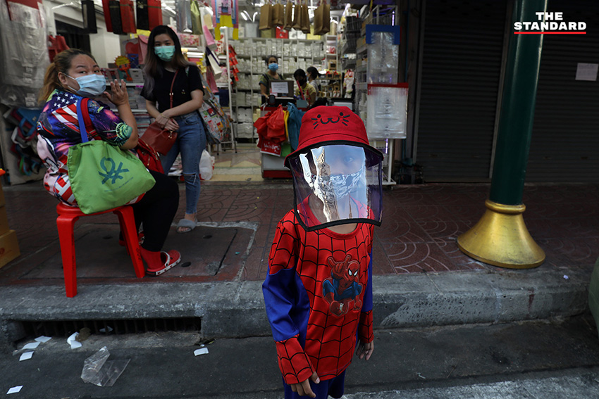 เด็กชายใส่หมวกป้องกันใบหน้าขณะวิ่งเล่นบริเวณย่านสำเพ็ง