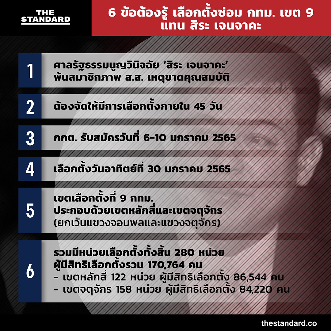 หลังจากที่วันนี้ (6 มกราคม) คณะกรรมการการเลือกตั้ง (กกต.) เปิดรับผู้ลงสมัครเลือกตั้งซ่อม เขต 9 กรุงเทพมหานคร (กทม.) แทน สิระ เจนจาคะ ที่พ้นสมาชิกภาพจากคำวินิจฉัยของศาลรัฐธรรมนูญ โดยมีกำหนดเลือกตั้งในวันที่ 30 มกราคม 2565
