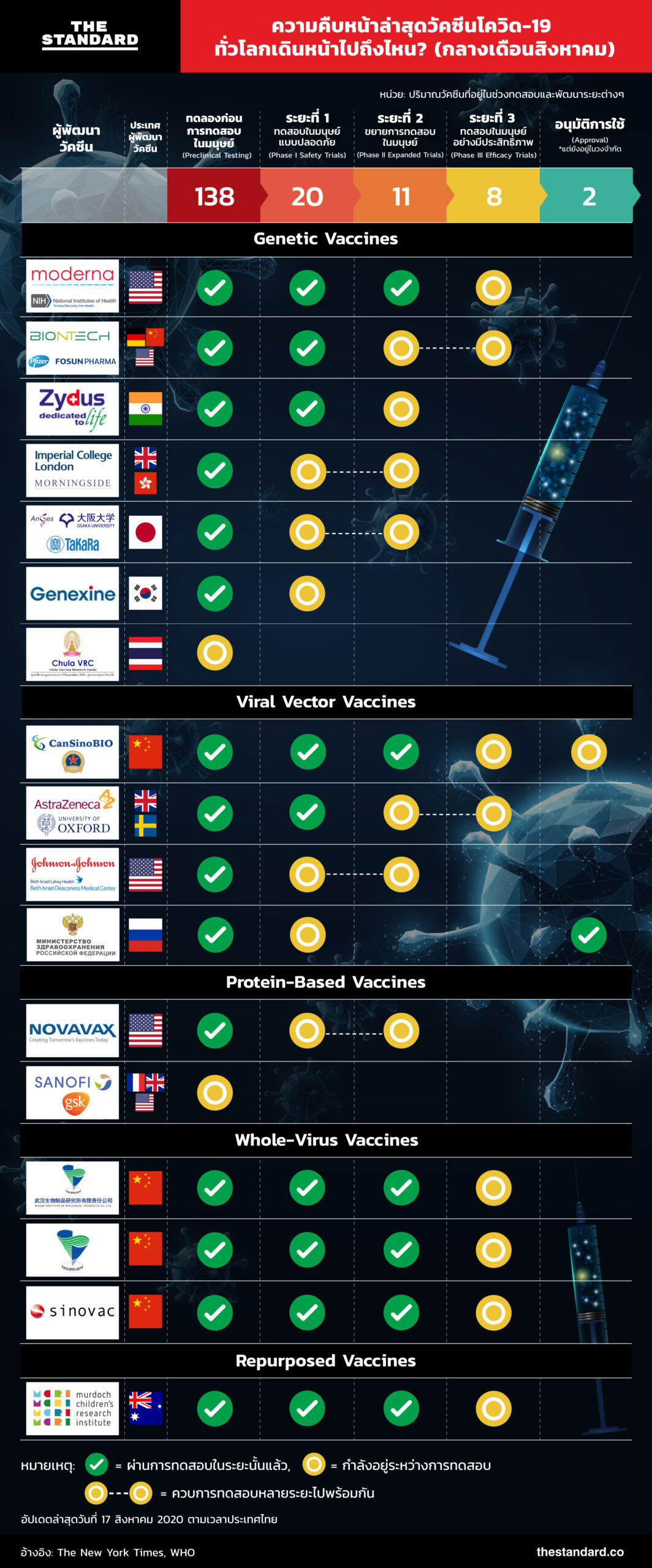 โควิด-19 กำลังแพร่ระบาดเข้าสู่เดือนที่ 8 แล้ว ปัจจุบันมีวัคซีนโรคโควิด-19 กว่า 170 ตัวที่กำลังอยู่ระหว่างการพัฒนาโดยทีมนักวิจัยจากทั่วโลก โดยทั่วไปต้องมีการศึกษา วิจัย และทดลองก่อนจะได้รับอนุญาตให้นำไปใช้กับผู้ป่วย แต่สำหรับโควิด-19 นั้นเป็นกรณีฉุกเฉินที่นักวิทยาศาสตร์ทั่วโลกต้องเร่งขั้นตอนการทดสอบและพัฒนาเพื่อให้สามารถผลิตวัคซีนที่มีประสิทธิภาพและความปลอดภัยได้ตามเป้าหมายภายในปี 2021
