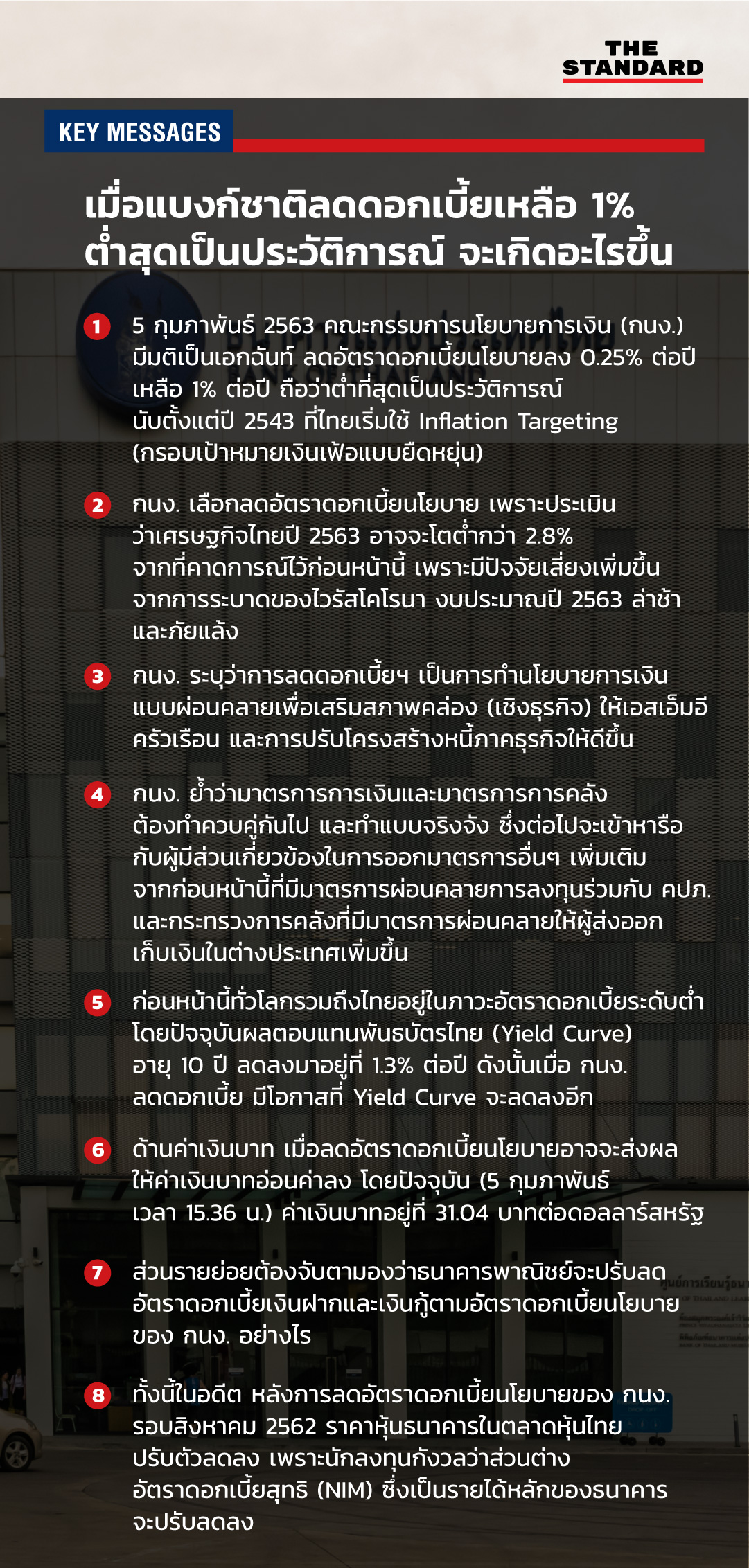 - กนง. ระบุว่าการลดดอกเบี้ยฯ เป็นการทำนโยบายการเงินแบบผ่อนคลายเพื่อเสริมสภาพคล่อง (เชิงธุรกิจ) ให้เอสเอ็มอีครัวเรือน และการปรับโครงสร้างหนี้ภาคธุรกิจให้ดีขึ้น