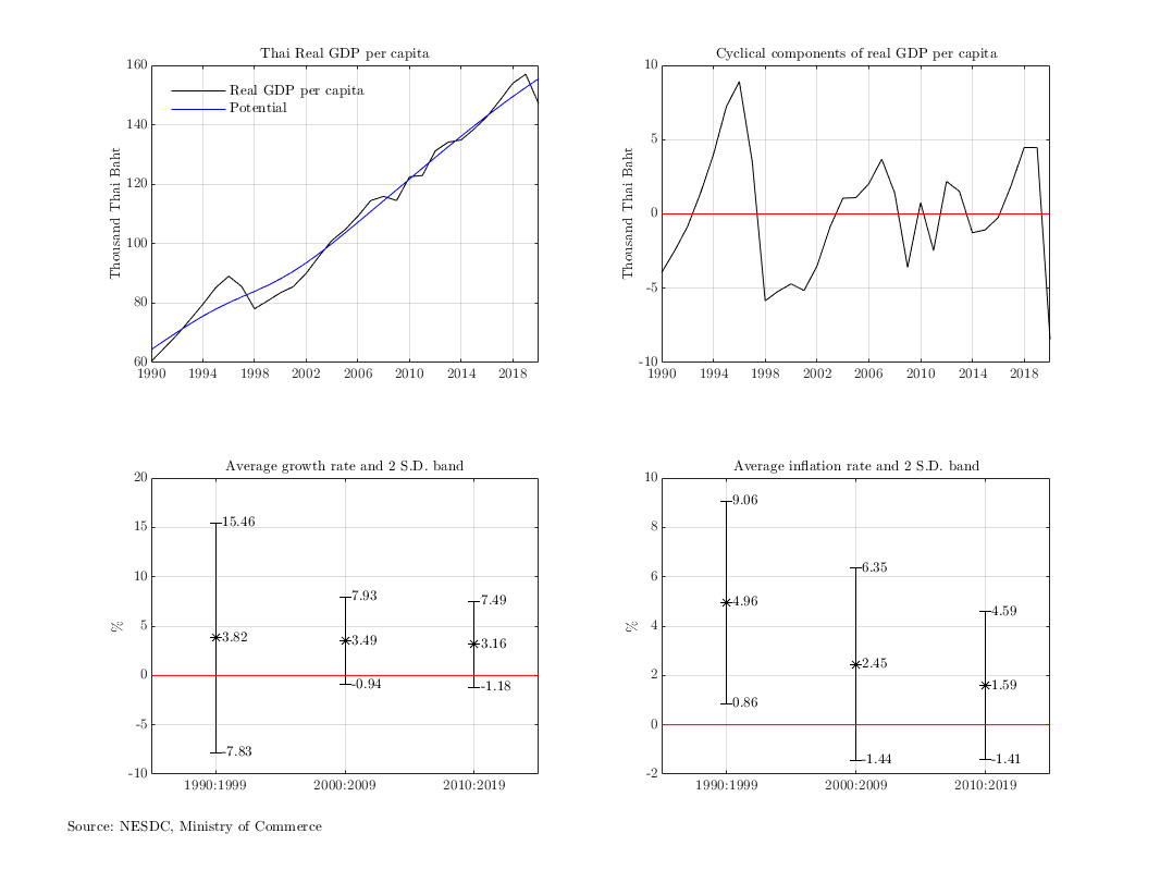 การปรับโครงสร้างเชิงสถาบันของ ธปท. นำไปสู่การปรับแนวนโยบายในการบริหารเศรษฐกิจและกำกับดูแลสถาบันการเงิน ไม่ว่าจะเป็นการเปลี่ยนกรอบการดำเนินนโยบายการเงินมาเป็นการกำหนดเป้าหมายเงินเฟ้อ การประกาศใช้พระราชบัญญัติธุรกิจสถาบันการเงินและการจัดทำแผนพัฒนาระบบสถาบันการเงินขึ้นใหม่ การปรับโครงสร้างส่งผลให้ระบบเศรษฐกิจการเงินไทยเติบโตได้อย่างมีเสถียรภาพขึ้น และสามารถก้าวผ่านบททดสอบสำคัญ ไม่ว่าจะเป็นวิกฤตเศรษฐกิจโลกในปี 2008 หรือความผันผวนของกระแสเงินทุนเคลื่อนย้ายในปี 2006 รูปที่ 1 ชี้ว่าเศรษฐกิจไทยเคลื่อนไหวผันผวนในกรอบที่แคบลง ขณะที่การหดตัวไม่ได้รุนแรงเท่าช่วงเวลาแรก อัตราเงินเฟ้อก็มีความผันผวนน้อยลงเช่นกัน