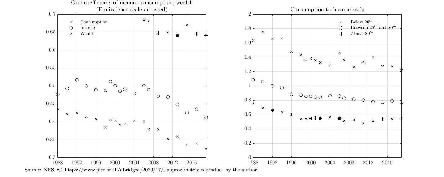 ปัญหาเรื่องความเหลื่อมล้ำในเศรษฐกิจไทยซับซ้อนและรุนแรง บทความเรื่อง เจาะลึกความเหลื่อมล้ำตลอดสามทศวรรษของประเทศไทย ชี้ว่าเศรษฐกิจไทยมีปัญหาความเหลื่อมล้ำทางด้านทุนทางเศรษฐกิจ สะท้อนจากความเหลื่อมล้ำเชิงความมั่งคั่งที่อยู่ในระดับสูงมาก โดยดัชนี Gini ของความมั่งคั่งมีค่าสูงถึง 0.65 ในปี 2019 และลดลงช้ามากในระยะสิบปีที่ผ่านมา (รูปที่ 2) นอกจากจะมีทุนน้อยแล้ว ทุนยังไม่สมดุลกับรายได้จ่ายอีกด้วย โดยครัวเรือนรายได้น้อย (มีรายได้น้อยกว่าเปอร์เซ็นไทล์ที่ 20) ยังมีค่าใช้จ่ายในการบริโภคสูงกว่ารายได้ เมื่อเทียบกับครัวเรือนรายได้ปานกลาง (เปอร์เซ็นไทล์ที่ 20-80) และครัวเรือนรายได้สูง (สูงกว่าเปอร์เซ็นไทล์ที่ 80) ที่มีรายได้สูงกว่าค่าใช้จ่าย