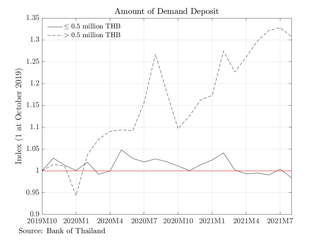 ปัญหาความเหลื่อมล้ำทางด้านโอกาสทางเศรษฐกิจกำลังถ่วงเศรษฐกิจไทยลงอย่างรุนแรงท่ามกลางวิกฤตโควิดตลอดหลายเดือนที่ผ่านมา เราจะเห็นว่าเศรษฐกิจไทยมีพลวัตคล้ายกับตัวอักษร K โดยผู้มีโอกาสทางเศรษฐกิจสูง เช่น ครัวเรือนรายได้สูงและธุรกิจขนาดใหญ่ มีภูมิคุ้มกันและฟื้นตัวจากวิกฤตได้เร็ว ขณะที่ผู้ขาดโอกาสทางเศรษฐกิจ เช่น ครัวเรือนรายได้น้อยและธุรกิจขนาดเล็กได้รับผลกระทบอย่างรุนแรง พลวัตลักษณะนี้ปรากฏในดัชนีทางเศรษฐกิจหลายตัว รวมถึงปริมาณเงินฝากกระแสรายวัน ซึ่งสะท้อนสภาพคล่องของครัวเรือนและธุรกิจที่แตกต่างกันระหว่างบัญชีที่มีมูลค่าเงินฝากเท่ากับหรือต่ำกว่า 500,000 บาท และบัญชีที่มีมูลค่าสูงกว่า 500,000 บาท (รูปที่ 3) ธรรมชาติของวิกฤตโควิดที่ยืดเยื้อและไม่แน่นอน ทำให้ความแตกต่างระหว่างคนสองกลุ่มยิ่งเด่นชัด