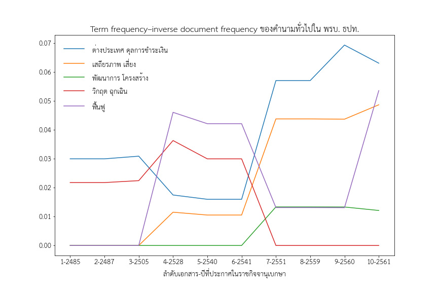 หลักฐานเชิงประจักษ์ที่สำคัญคือการปรับปรุง พ.ร.บ. ธปท. ให้เอื้อต่อการดำเนินนโยบายเพื่อรักษาเสถียรภาพทางเศรษฐกิจการเงินมากขึ้น โดยผลจากการวัดความถี่ของคำนามทั่วไป* ใน พ.ร.บ. ชี้ว่า คำที่เกี่ยวข้องกับเสถียรภาพทางเศรษฐกิจ (‘เสถียรภาพ’ ‘เสี่ยง’) และที่เกี่ยวข้องกับเศรษฐกิจการเงินระหว่างประเทศ (‘ต่างประเทศ’ ‘ดุลการชำระเงิน’) (รูปที่ 5) การปรับโครงสร้างเชิงสถาบันการเงินตามมาด้วยการดำเนินนโยบายเพื่อรักษาเสถียรภาพทางเศรษฐกิจการเงินอย่างเข้มข้น ไม่ว่าจะเป็นการปรับเป้าหมายนโยบายการเงิน การออก พ.ร.บ. สถาบันการเงิน และการประกาศแผนพัฒนาระบบสถาบันการเงินตามมาอีกหลายฉบับ